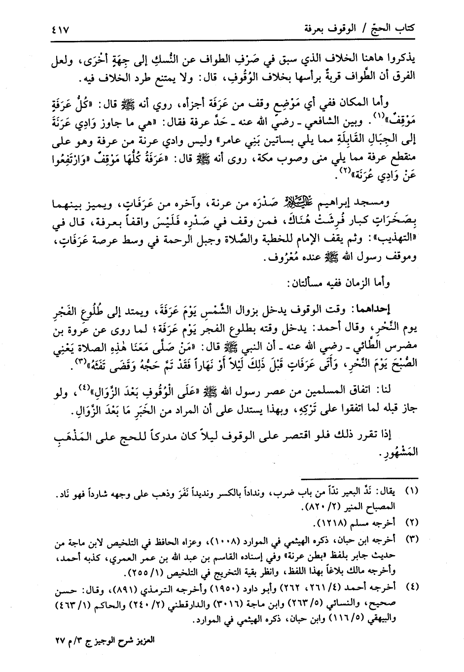 (¬3) أخرجه ابن حبان، ذكره الهيثمي في الموارد (1008)، وعزاه الحافظ في التلخيص لابن ماجة من حديث جابر بلفظ "بطن عرنة" وفي إسناده القاسم بن عبد الله بن عمر العمري، كذبه أحمد، وأخرجه مالك بلاغاً بهذا اللفظ، وانظر بقية التخريج في التلخيص (1/ 255).