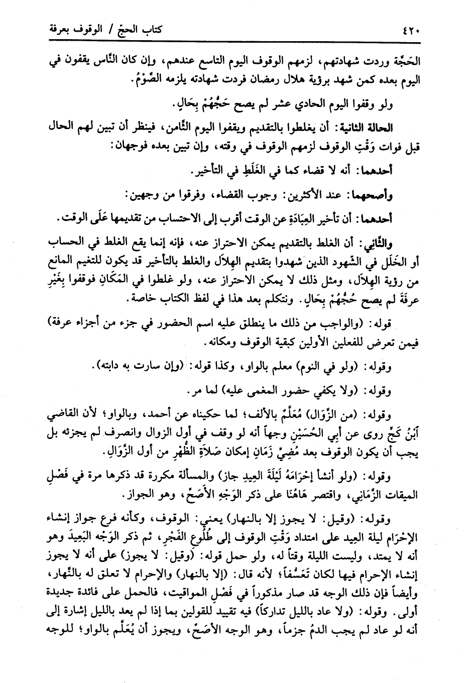 والثَّانِي: أن الغلط بالتقديم يمكن الاحتراز عنه، فإنه إنما يقع الغلط في الحساب أو الخَلَل في الشّهود الذين شهدوا بتقديم الهِلاَل والغلط بالتأخير قد يكون للتغيم المانع من رؤية الهِلاَل، ومثل ذلك لا يمكن الاحتراز عنه، ولو غلطوا في المَكَانِ فوقفوا بِغَيْرِ عرفَةَ لم يصح حُجُّهُمْ بِحَالٍ. ونتكلم بعد هذا في لفظ الكتاب خاصة.