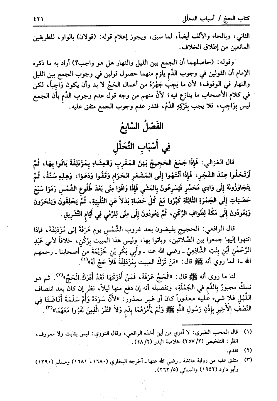 قال الغزالي: فَإذَا جَمَعَ الحَجِيجُ بَيْنَ المَغْرِبِ وَالعِشَاءِ بِمُزْدَلِفَةَ بَاتُوا بِهَا، ثُمَّ ارْتَحَلُوا عِنْدَ الفَجْرِ، فَإذَا انْتَهُوا إلَى المَشْعَرِ الحَرَامِ وَقَفُوا وَدَعَوْا، وَهِذِهِ سُنَّةٌ، ثُمَّ يَتَجَاوَزُونَهُ إلَى وَادِي مُحَسِّرِ فَيُسْرِعُونَ بِالمَشْيِ فَإذَا وَافَوْا مِنىً بَعْدَ طُلُوعِ الشَّمْسِ رَمَوْا سَبْعَ حَصَيَاتٍ إلَى الجَمرَةِ الثَّالِثَةِ كَبَّرُوا مَعَ كُلِّ حَصَاةِ بَدَلاً عَنِ التَّلْبِيَةِ، ثُمَّ يَحْلِقُونَ وَينْحَرُونَ وَيَعُودُونَ إلَى مَكَّةَ لِطَوَافِ الرُّكْنِ، ثُمَّ يَعُودُونَ إلَى مِنىً لِلرَّمْيِ فِي أَيَّامِ التَّشْرِيقِ.