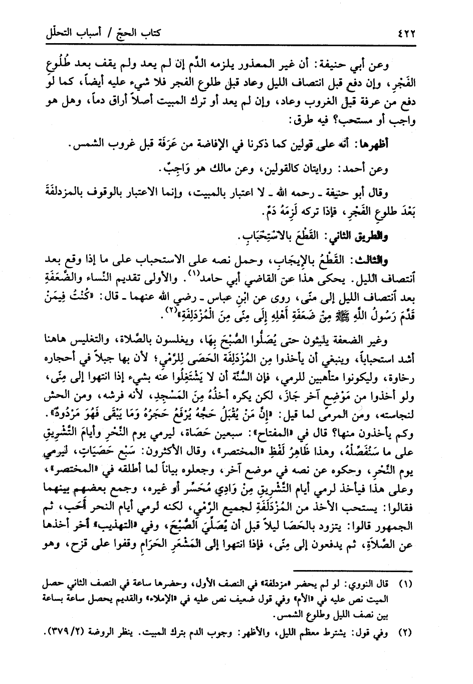 وعن أبي حنيفة: أن غير المعذور يلزمه الدَّم إن لم يعد ولم يقف بعد طُلُوعِ الفَجْرِ، وإن دفع قبل انتصاف الليل وعاد قبل طلوع الفجر فلا شيء عليه أيضاً، كما لوَ دفع من عرفة قبل الغروب وعاد، وإن لم يعد أو ترك المبيت أصلاً أراق دماً، (1) وهل هو واجب أو مستحب؟ فيه طرق:
