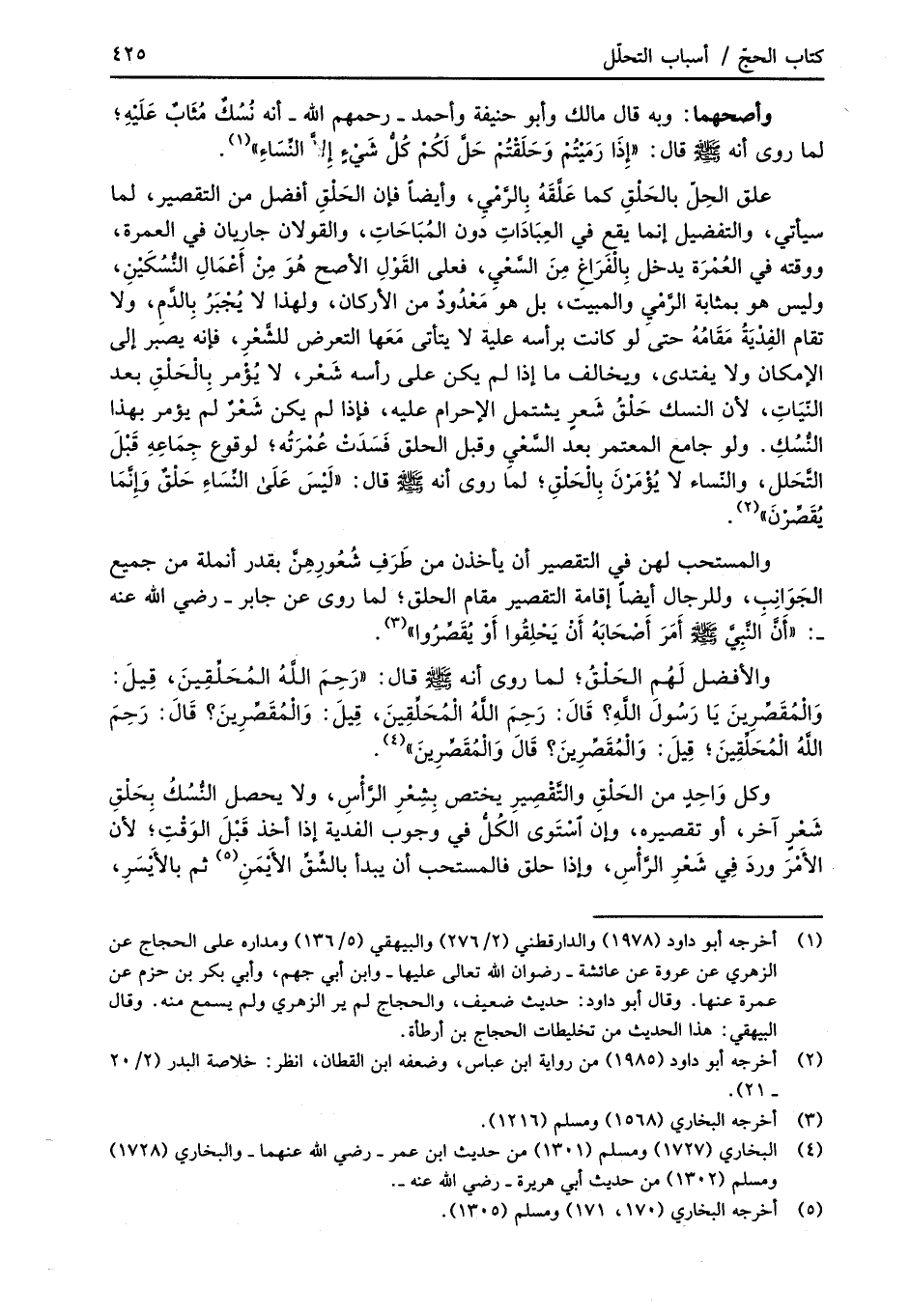 علق الحِلّ بالحَلْقِ كما عَلَّقَهُ بِالرَّمْيِ، وأيضاً فإن الحَلْقِ أفضل من التقصير، لما سيأتي، والتفضيل إنما يقع في العِبَادَاتِ دون المُبَاحَاتِ، والقولان جاريان في العمرة، ووقته في العُمْرَة يدخل بِالْفَرَاغِ مِنَ السَّعْيِ، فعلى القَوْلِ الأصح هوَ مِنْ أَعمَالِ النُّسكَيْنِ، وليس هو بمثابة الرَّمْيِ والمبيت، بل هو مَعدُودٌ من الأركان، ولهذا لا يُجْبَرُ بِالدَّمِ، ولا تقام الفِدْيَةُ مَقَامُهُ حتى لو كانت برأسه علية لا يتأتى مَعَها التعرض للشَّعْرِ، فإنه يصبر إلى الإمكان ولا يفتدى، ويخالف ما إذا لم يكن على رأسه شَعْر، لا يُؤْمر بالْحَلْقِ بعد النّيَاتِ، لأن النسك حَلْقُ شَعرٍ يشتمل الإحرام عليه، فإذا لم يكن شَعْرٌ لَم يؤمر بهذا النُّسُكِ. ولو جامع المعتمر بعد السَّعْيِ وقبل الحلق فَسَدَتْ عُمْرَتُه؛ لوقوع جِمَاعِهِ قَبْلَ التَّحَلل، والنّساء لا يُؤْمَرْنَ بِالْحَلْقِ؛ لما روى أنه -صلى الله عليه وسلم- قال: "لَيْسَ عَلَي النِّسَاءِ حَلْقٌ وَإنَّمَا يُقَصِّرْنَ" (¬2).