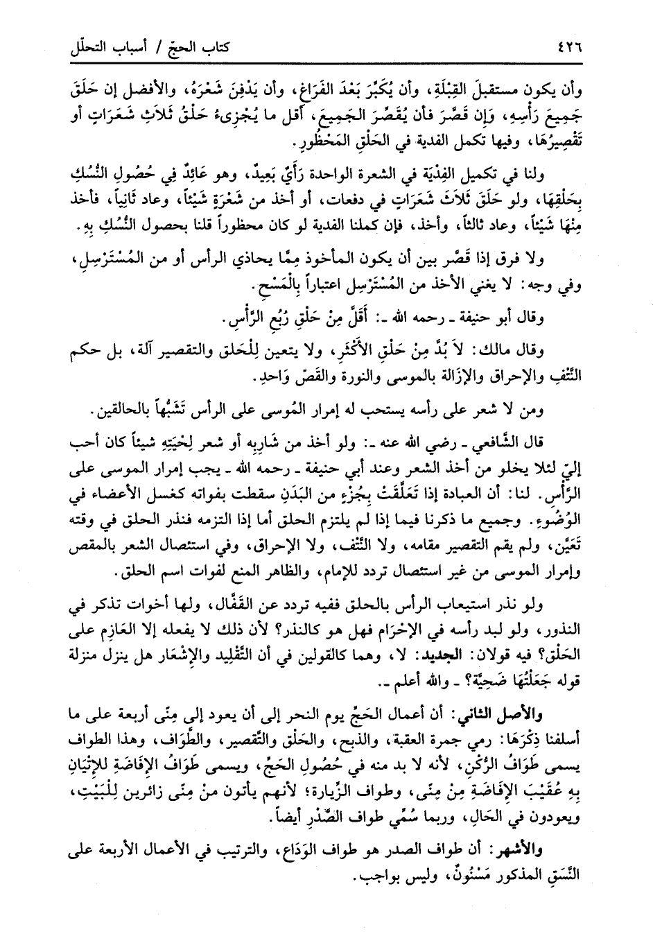 قال الشَّافعي -رضي الله عنه-: ولو أخذ من شَارِبِه أو شعر لحْيَتِهِ شيئاً كان أحب إليّ لئلا يخلو من أخذ الشعر وعند أبي حنيفة -رحمه الله- يجب إمرار الموسى على الرَّأسِ. لنا: أن العبادة إذا تَعَلَّقَتْ بِجُزْءٍ من البَدَنِ سقطت بفواته كغسل الأعضاء في الوُضُوءِ. وجميع ما ذكرنا فيما إذا لم يلتزم الحلق أما إذا التزمه فنذر الحلق في وقته تَعَيَّن، ولم يقم التقصير مقامه، ولا النَّتْف، ولا الإحراق، وفي استئصال الشعر بالمقص وإمرار الموسى من غير استئصال تردد للإمام، والظاهر المنع لفوات اسم الحلق.