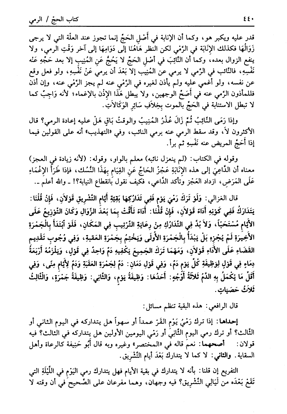 قال الغزالي: وَلَوْ تَرَكَ رَمْيَ يَوْمٍ فَفِي تَدَارُكِهَا بَقِيَّةِ أَيَّامِ التَّشْرِيقِ قَوْلاَنِ، فَإِنْ قُلْنَا: يَتَدَارَكُ فَفِي كَوْنِهِ أَدَاءً قَوْلاَنِ، فَإِنْ قُلْنَا: أَدَاءً تَأَقَّتْ بِمَا بَعْدَ الزَّوَالِ وَكَانَ التَّوْزِيعُ عَلَى الأَيَّامِ مُسْتَحَبّاً، وَلاَ بُدَّ فِي التَّدَارُكِ مِنْ رِعَايَةِ التَّرْتِيبِ فِي المَكَانِ، فَلَوْ ابْتَدَأَ بِالْجَمْرَةِ الأَخِيرَةِ لَمْ يُجْزِهِ بَلْ يَبْدَأُ بِالْجَمْرَةِ الأولَى وَيَخْتِمُ بِجَمْرَةِ العَقبةِ، وَفِي وُجُوب تَقْدِيم القَضَاءِ عَلَى الأَدَاءِ قَوْلاَنِ، وَمَهْمَا تَرَكَ الجَمِيعَ يَكْفِيهِ دَمٌ وَاحِدٌ فِي قَوْلٍ، وَيلْزَمُهُ أَرْبَعَةُ دِمَاءٍ فِي قوْلٍ لِوَظِيفَةِ كُلِّ يَوْمٍ دَمٌ، وَفِي قَوْلِ دَمَانِ: دَمٌ لِجَمْرَةِ العَقَبَةِ وَدَمٌ لِأَيَّامِ مِنًى، وَفِي أَقَلِّ مَا يُكْمَلُ بِهِ الدَّمُ ثَلاَثَةُ أَوْجُهٍ: أَحَدُهَا: وَظِيفَةُ يَوْمٍ، وَالثَّانِي: وَظِيفَةُ جَمْرَةٍ، وَالْثَّالِثُ ثَلاَثُ حَصَيَاتٍ.