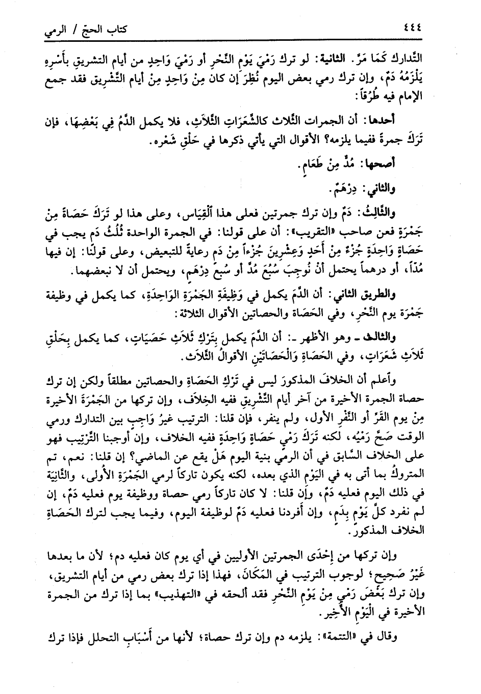 واعلم أن الخلافَ المذكورَ ليس في تَرْكِ الحَصَاةِ والحصاتين مطلقاً ولكن إن ترك حصاة الجمرة الأخيرة من آخر أيام التَّشْرِيقِ ففيه الخِلاَف، وإن تركها من الجَمْرَةَ الأخيرة مِنْ يوم القَرِّ أو النَّفْرِ الأول، ولم ينفر، فإن قلنا: الترتيب غيرُ وَاجِبٍ بين التدارك ورمي الوقت صَحَّ رَمْيُه، لكنه تَرَكَ رَمْى حَصَاةٍ وَاحِدَةٍ ففيه الخلاف، وإنَ أوجبنا التَّرتِيب فهو على الخلاف السَّابق في أن الرمي بنية اليوم هَلْ يقع عن الماضي؟ إن قلنا: نعم، تم المتروكُ بما أتى به في اليَوْمِ الذي بعده، لكنه يكون تاركاً لرمي الجَمرَةِ الأولى، والثَّانِيَة في ذلك اليوم فعليه دَمٌ، وإن قلنا: لا كان تاركاً رمي حصاة ووظيفة يوم فعليه دَمٌ، إن لم نفرد كلَّ يَوْمٍ بِدَمٍ، وإن أَفردنا فعليه دَمٌ لوظيفة اليوم، وفيما يجب لترك الحَصَاةِ الخلاف المذكور.