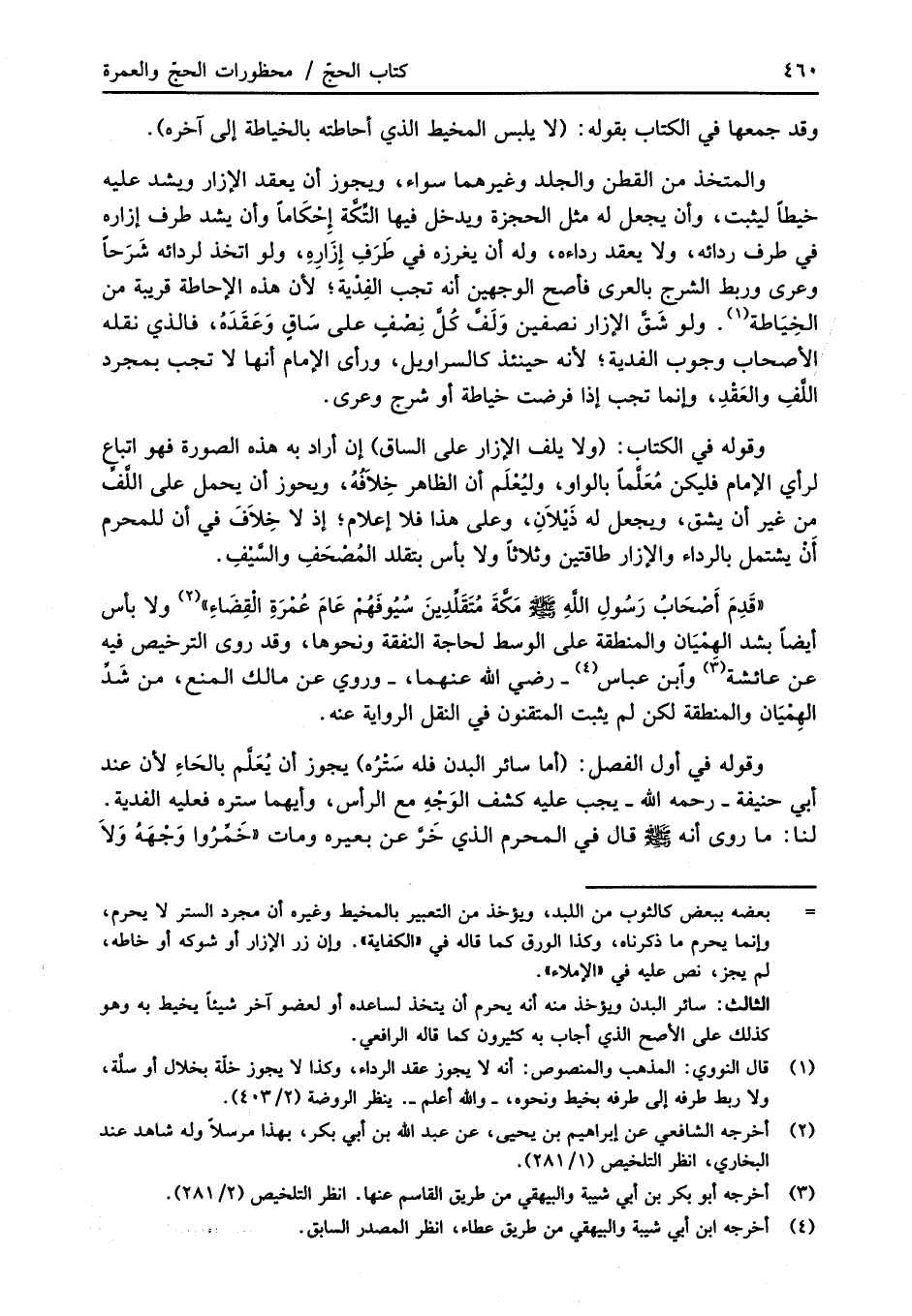 والمتخذ من القطن والجلد وغيرهما سواء، ويجوز أن يعقد الإزار ويشد عليه خيطاً ليثبت، وأن يجعل له مثل الحجزة ويدخل فيها التِّكَّة إِحْكَاماً وأن يشد طرف إزاره في طرف ردائه، ولا يعقد رداءه، وله أن يغرزه في طَرَفِ إِزَارِهِ، ولو اتخذ لردائه شَرَحاً وعرى وربط الشرج بالعرى فأصح الوجهين أنه تجب الفِدْية؛ لأن هذه الإحاطة قريبة من الخِيَاطة (¬1). ولو شَقَّ الإزار نصفين وَلَفَّ كُلَّ نِصْفٍ على سَاقٍ وَعَقَدَهُ، فالذي نقله الأصحاب وجوب الفدية؛ لأنه حينئذ كالسراويل، ورأى الإمام أنها لا تجب بمجرد اللَّفِ والعَقْدِ، وإنما تجب إذا فرضت خياطة أو شرج وعرى.