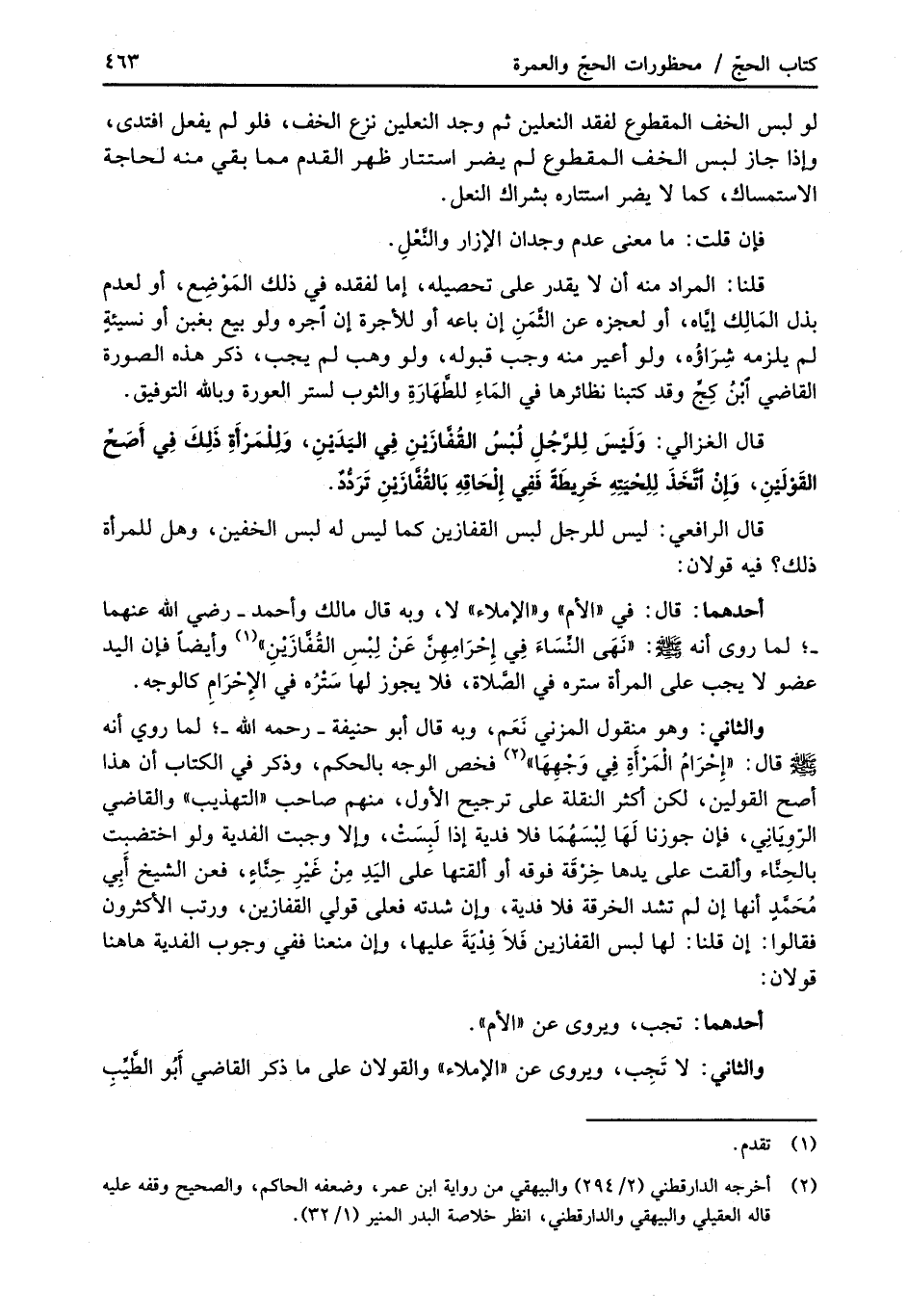 والثاني: وهو منقول المزني نَعَم، وبه قال أبو حنيفة -رحمه الله-؛ لما روي أنه -صلى الله عليه وسلم- قال: "إِحْرَامُ الْمَرْأَةِ فِي وَجْهِهَا" (¬2) فخص الوجه بالحكم، وذكر في الكتاب أن هذا أصح القولين، لكن أكثر النقلة على ترجيح الأول، منهم صاحب "التهذيب" والقاضي الرّوَيانِي، فإن جوزنا لَهَا لِبْسَهُمَا فلا فدية إذا لَبِسَتْ، وإلا وجبت الفدية ولو اختضبت بالحِنَّاء وألقت على يدها خِرْقَة فوقه أو ألقتها على اليَدِ مِنْ غَيْرِ حِنَّاءٍ، فعن الشيخ أَبِي مُحَمَّدٍ أنها إن لم تشد الخرقة فلا فدية، وإن شدته فعلى قولي القفازين، ورتب الأكثرون فقالوا: إن قلنا: لها لبس القفازين فَلاَ فِدْيَةَ عليها، وإن منعنا ففي وجوب الفدية هاهنا قولان: