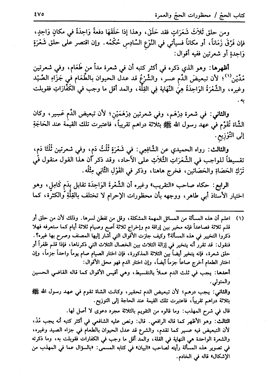 الرابع: حكاه صاحب "التقريب" وغيره أن الشَّعْرةَ الوَاحِدَة تقابل بدَمٍ كَامِلٍ، وهو اختيار الأستاذ أبي طاهر، ووجهه بأن محظورات الإحرام لا تختلف بالقِلَّةِ والكثرة، كما