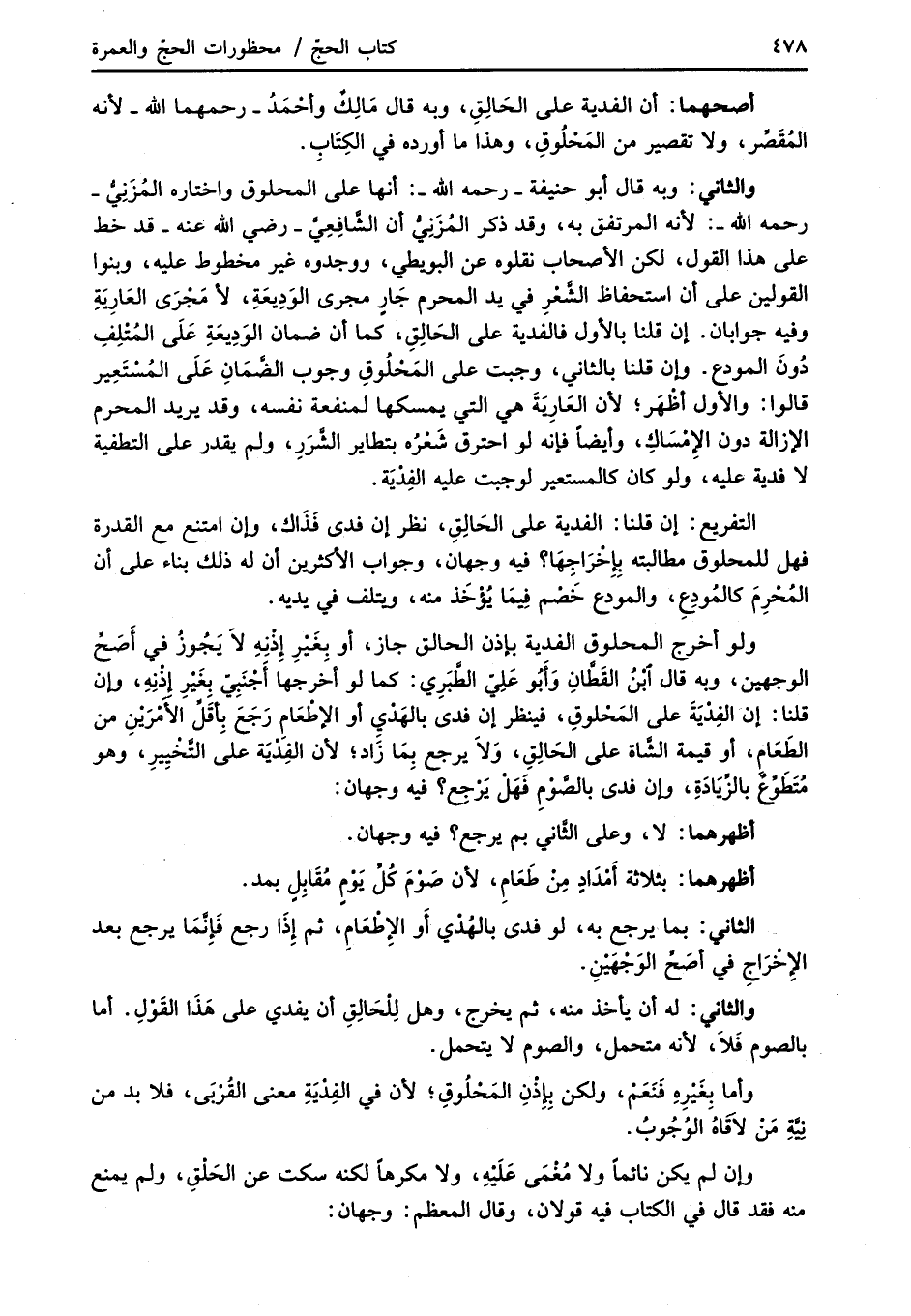 والثاني: وبه قال أبو حنيفة -رحمه الله-: أنها على المحلوق واختاره المُزَنِيُّ - رحمه الله-: لأنه المرتفق به، وقد ذكر المُزَنِيُّ أن الشَّافِعِيَّ -رضي الله عنه- قد خط على هذا القول، لكن الأصحاب نقلوه عن البويطي، ووجدوه غير مخطوط عليه، وبنوا القولين على أن استحفاظ الشَّعْرِ في يد المحرم جَارٍ مجرى الوَدِيعَةِ، لأ مَجْرَى العَارَيةِ وفيه جوابان. إن قلنا بالأول فالفدية على الحَالِقِ، كما أن ضمان الوَدِيعَةِ عَلَى المُتْلِفِ دُونَ المودع. وإن قلنا بالثاني، وجبت على المَحْلُوقِ وجوب الضَّمَانِ عَلَى المُسْتَعِير قالوا: والأول أظْهَر؛ لأن العَارِيةَ هي التي يمسكها لمنفعة نفسه، وقد يريد المحرم الإزالة دون الإِمْسَاكِ، وأيضاً فإنه لو احترق شَعْرُه بتطاير الشَّرَرِ، ولم يقدر على التطفية لا فدية عليه، ولو كان كالمستعير لوجبت عليه الفِدْيَة.