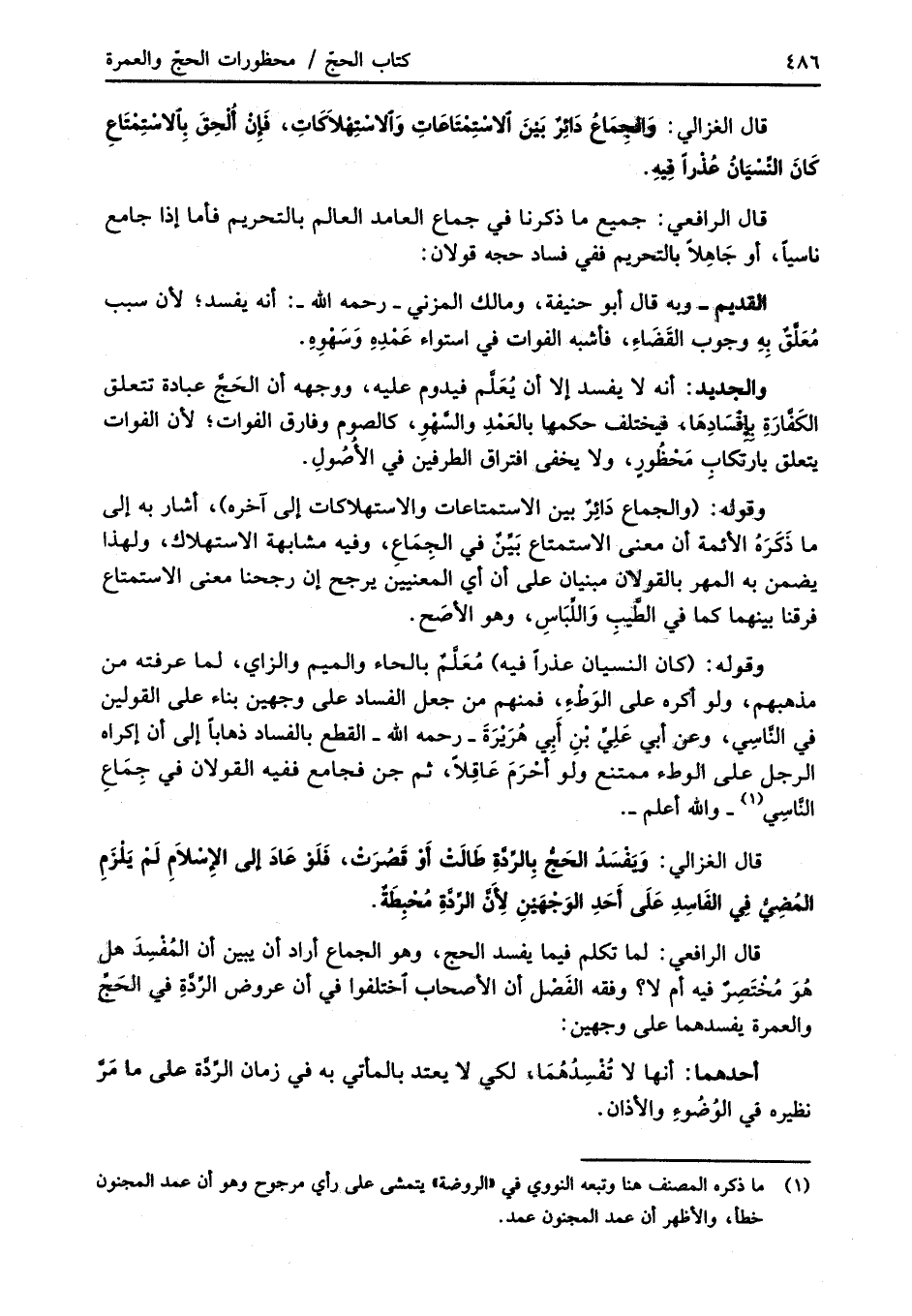 وقوله: (كان النسيان عذراً فيه) مُعَلَّمٌ بالحاء والميم والزاي، لما عرفته من مذهبهم، ولو أكره على الوَطْءِ، فمنهم من جعل الفساد على وجهين بناء على القولين في النَّاسِي، وعن أبي عَلِيِّ بْنِ أَبِي هُرَيْرَةَ -رحمه الله- القطع بالفساد ذهاباً إلى أن إكراه الرجل على الوطء ممتنع ولو أحْرَمَ عَاقِلاً، ثم جن فجامع ففيه القولان في جِمَاعِ النَّاسِي (¬1) -والله أعلم-.