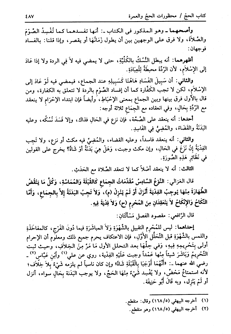 أظهرهما: أنه يبطل النُّسُكُ بالكُلِّيَّةِ، حتى لا يمضي فيه لاَ فِي الردة ولا إذا عَادَ إلى الإِسْلاَمِ، لأن الرِّدَّةَ محبطَةٌ لِلْعِبَادَةِ.