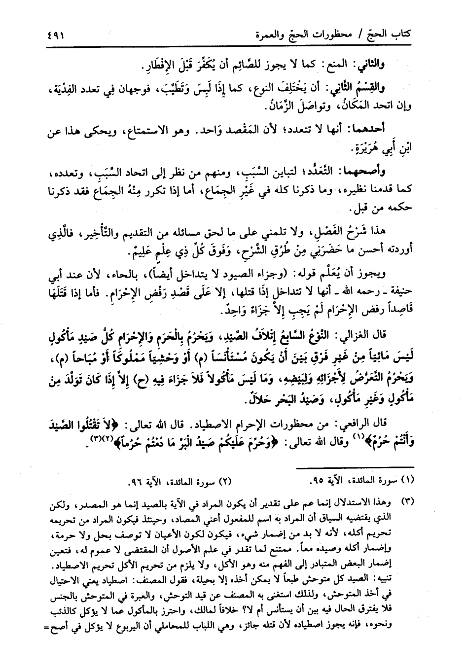 قال الغزالي: النَّوْعُ السَّابعُ إتْلاَفُ الصَّيْدِ، وَيَحْرُمُ بِالْحَرَمِ وَالإِحْرَامِ كُلُّ صَيْدِ مَأْكُولٍ لَيْسَ مَائِيّاً مِنْ غَيْرِ فَرْقِ بَيْنَ أَنْ يَكُونَ مُسْتَأنَسَاً (م) أَوْ وَحْشِيًّا مَمْلُوكَاً أو مُبَاحاً (م)، وَيَحْرُمُ التَّعَرُّضُ لِأَجْزَائِهِ وَلبَيْضِهِ، وَمَا لَيْسَ مَأْكُولاً فلاَ جَزَاءَ فِيهِ (ح) إلاَّ إِذَا كَانَ تَوَلَّدَ مِنْ مَأْكُولٍ وَغَيْرِ مَأْكُولٍ، وَصَيْدُ البَحْر حَلاَلٌ.