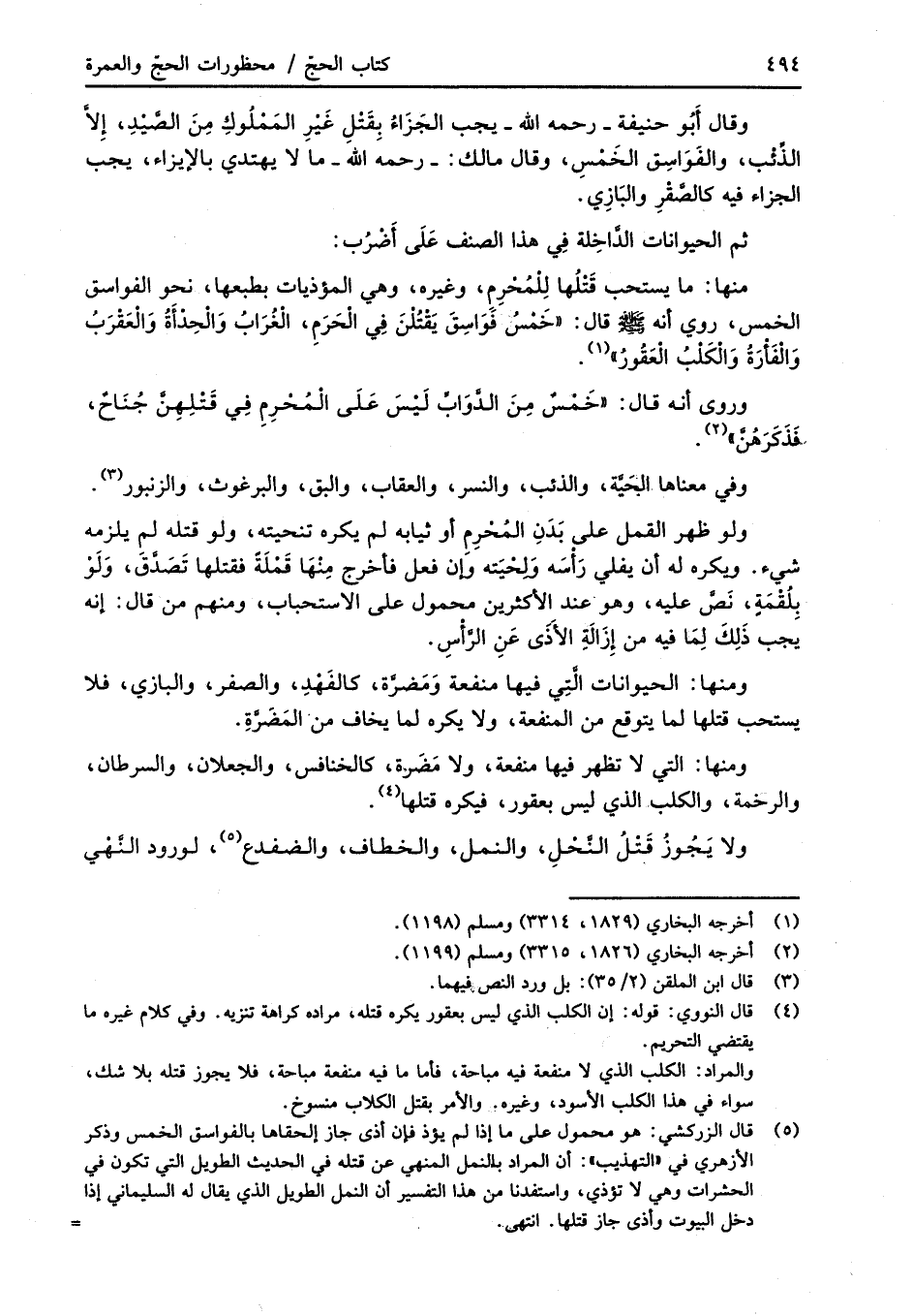 (¬5) قال الزركشي: هو محمول على ما إذا لم يؤذ فإن أذى جاز إلحقاها بالفواسق الخمس وذكر الأزهري في "التهذيب": أن المراد بالنمل المنهي عن قتله في الحديث الطويل التي تكون في الحشرات وهي لا تؤذي، واستفدنا من هذا التفسير أن النمل الطويل الذي يقال له السليماني إذا دخل البيوت وأذى جاز قتلها. انتهى. =