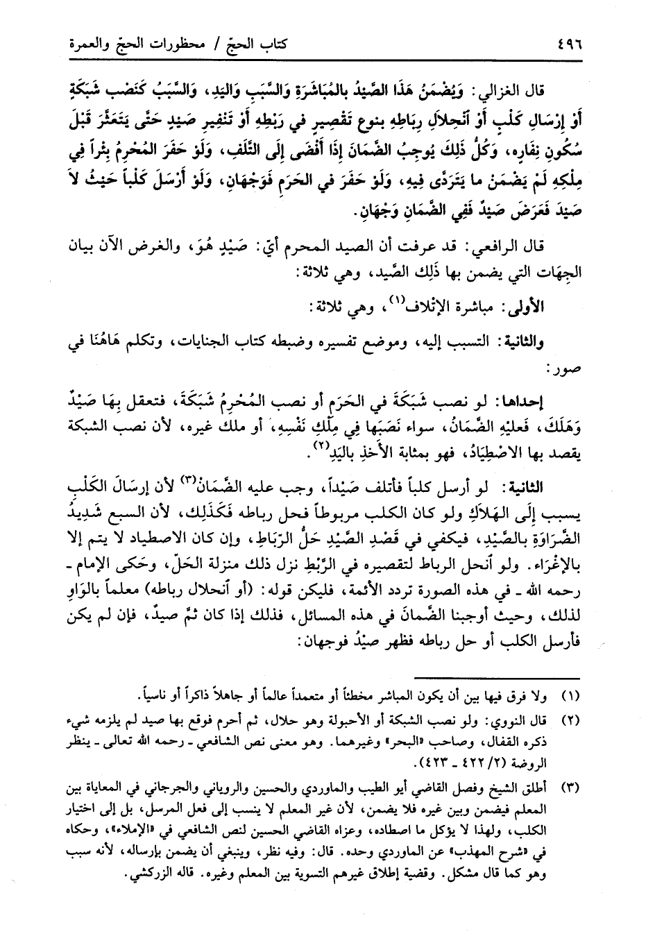 قال الغزالي: وَيُضْمَنُ هَذَا الصَّيْدُ بالمُبَاشَرَةِ وَالسَّبَبِ وَاليَدِ، وَالسَّبَبُ كَنَصْب شَبَكَةٍ أَوْ إِرْسَالِ كَلْبٍ أَوْ انْحِلاَلِ رِبَاطِهِ بنوع تَقْصِيرِ في رَبْطِهِ أَوْ تَنْفِيرِ صَيْدِ حَتَّى يَتَعَثَّرَ قَبْلَ سُكُونِ نِفَارِه، وَكُلُّ ذَلِكَ يُوجِبُ الضَّمَانَ إِذَا أَفْضَى إِلَى التَّلَفِ، وَلَوْ حَفَرَ المُحْرِمُ بِئْراً فِي مِلْكِهِ لَمْ يَضْمَن ما يَتَرَدَّى فِيهِ، وَلَوْ حَفَرَ في الحَرَمِ فَوَجْهَانِ، وَلَوْ أَرْسَلَ كَلْبًا حَيْثُ لاَ صَيْدَ فَعَرَضَ صَيْدٌ فَفِي الضَّمَانِ وَجْهَانِ.