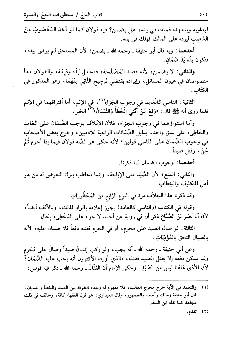 وقوله في الكتاب (والناسي كالعامد) يجوز إعلامه بالواو لذلك، وبالألف أيضاً، لأن أبا نَصْر بنَ الصَّبَّاغِ ذكر أن في رواية عن أحمد لا جزاء على المُخْطِئِ بِحَالٍ.