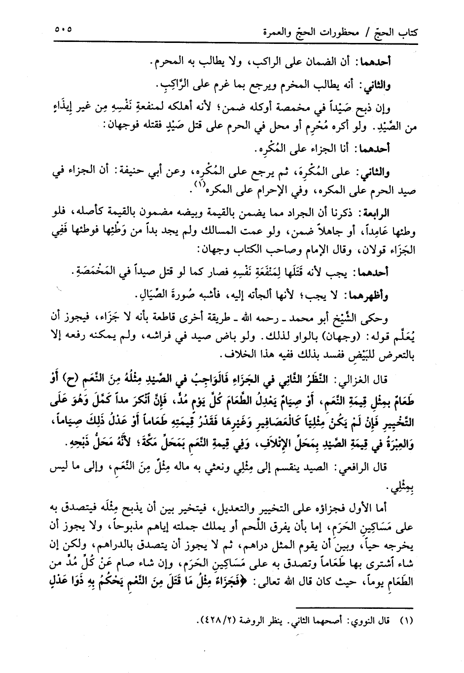 قال الغزالي: النَّظَرُ الثَّانِي في الجَزَاءِ فَالَوَاجِبُ في الصَّيْدِ مِثْلُهُ مِنَ النَّعَمِ (ح) أَوْ طَعَامٌ بمِثْلِ قِيمَةِ النَّعَمِ، أَوْ صِيَامٌ يَعْدِلُ الطَّعَامَ كُلَّ يَوْمٍ مُدٌّ، فَإِنَّ انْكرَ مدًا كَمَّلَ وَهُوَ عَلَى التَّخْيِيرِ فَإِنْ لَمْ يَكُنْ مِثْلِيّاً كَالْعَصَافِيرِ وَغَيْرِهَا فَقَدْرُ قِيمَتِهِ طَعَامًا أَوْ عَدْلُ ذَلِكَ صِيَاماً، وَالعِبْرَةُ في قِيمَةِ الصَّيْدِ بِمَحَلِّ الإِتلاَفِ، وَفِي قِيمةِ النَّعَمِ بَمَحَلِّ مَكَّةَ؛ لأَنَّهُ مَحَلُّ ذَبْحِهِ.