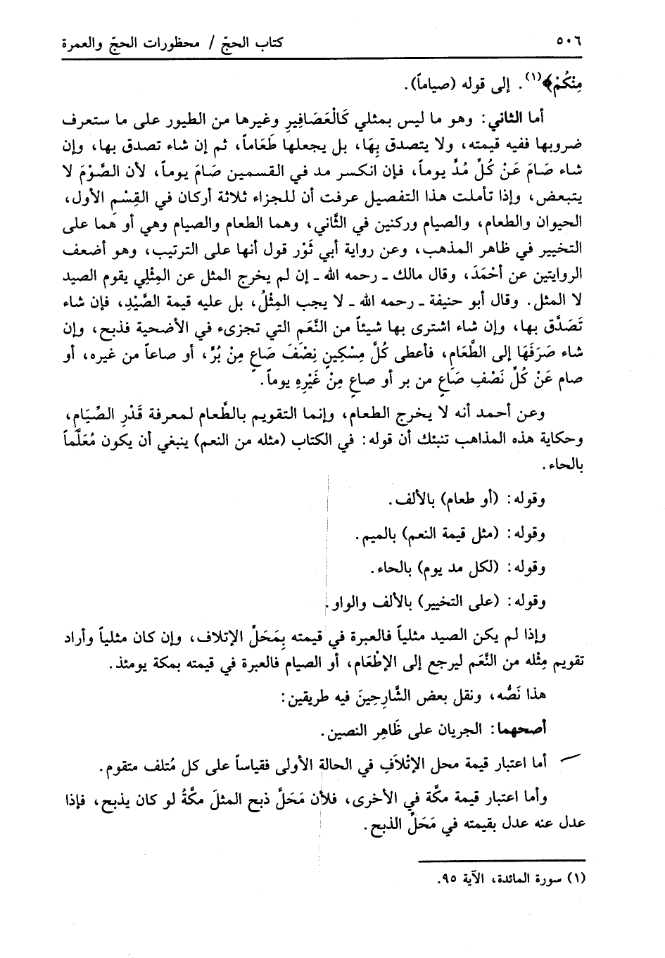 وعن أحمد أنه لا يخرج الطعام، وإنما التقويم بالطَّعام لمعرفة قَدْرِ الصِّيَام، وحكاية هذه المذاهب تنبئك أن قوله: في الكتاب (مثله من النعم) ينبغي أن يكون مُعَلَّماً بالحاء.