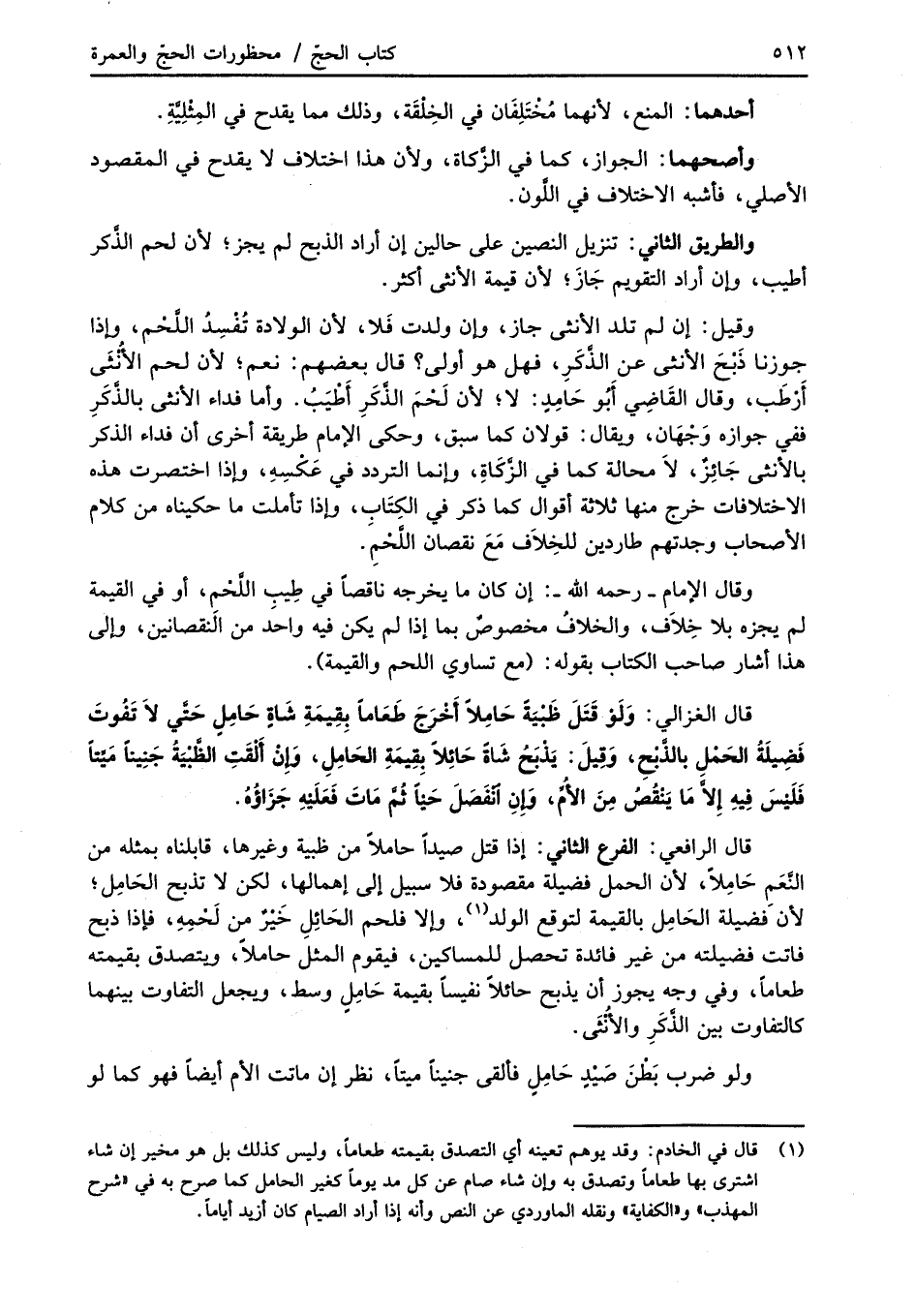 قال الغزالي: وَلَوْ قَتَلَ ظَبْيَةَ حَامِلاً أَخْرَجَ طَعَاماً بِقِيمَةِ شَاةٍ حَامِلٍ حَتَّي لاَ تَفُوتَ فَضِيلَةُ الحَمْلِ بالذَّبْحِ، وَقِيلَ: يَذْبَحُ شَاةً حَائِلاً بِقِيمَةِ الحَامِلِ، وَإِنْ أَلْقَتِ الظَّبْيَةُ جَنِيناً مَيِّتاً فَلَيْسَ فِيهِ إلاَّ مَا يَنْقُصُ مِنَ الأُمِّ، وَإِنِ انْفَصَلَ حَياً ثُمَّ مَاتَ فَعَلَيْهِ جَزَاؤُهُ.