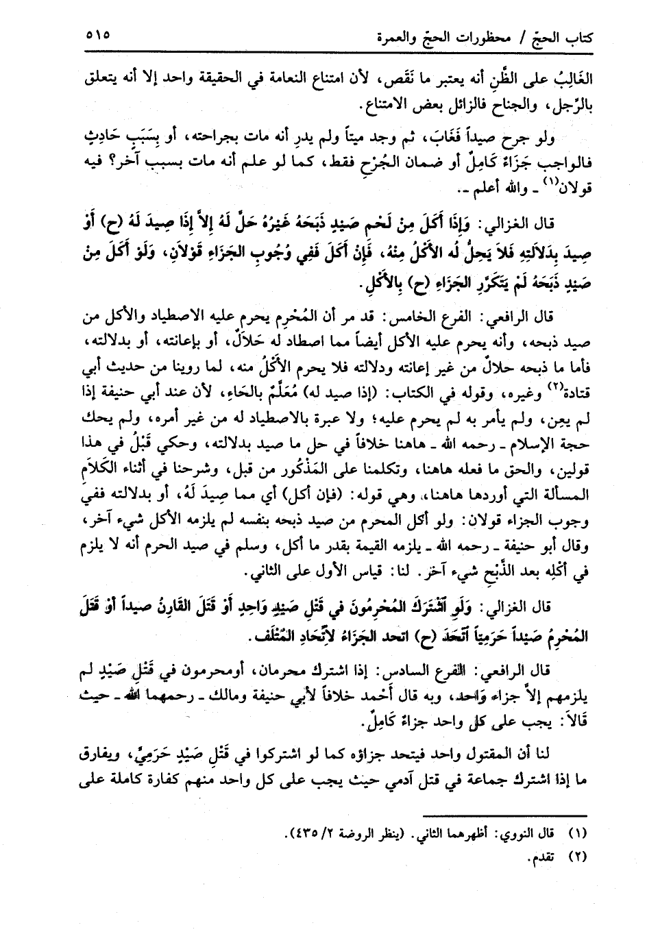 قال الغزالي: وَلَوِ اشْتَرَكَ المُحْرِمُونَ في قَتْلِ صَيْدٍ وَاحِدٍ أَوْ قَتَلَ القَارِنُ صيداً أوْ قَتَلَ المُحْرِمُ صَيْداً حَرَمِيّاً اتحد (ح) اتحد الجَزَاءُ لاِتِّحَادِ المُتْلَف.
