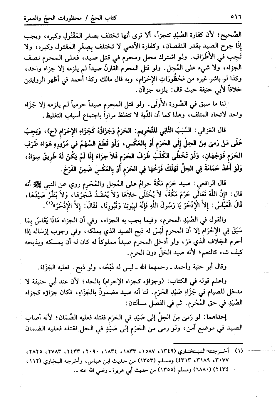 قال الغزالي: السَّبَبُ الثَّانِي للتَّحْرِيم: الحَرَمُ وَجَزَاؤُهُ كَجَزَاءِ الإحْرَامِ (ح)، وَيَجِبُ عَلَى مَنْ رَمىَ مِنَ الحِلِّ إلَى الحَرَمِ أَوْ بِالعَكْسِ، وَلَوْ قَطَعَ السَّهْمُ في مُرُورِهِ هَوَاءَ طَرَفِ الحَرَمِ فَوَجْهَانِ، وَلَو تَخَطَّى الكَلْبُ طَرَفَ الحَرَم فَلاَ جزَاءَ إِذَا لَمْ يَكُنْ لَهُ طَرِيقٌ سِوَاهُ، وَلَوْ أَخَذَ حَمَامَةٌ فِي الحِلِّ فَهَلَكَ فَرْخُهَا فِي الحَرَم أَوْ بِالعَكسِ ضَمِنَ الفَرْخَ.