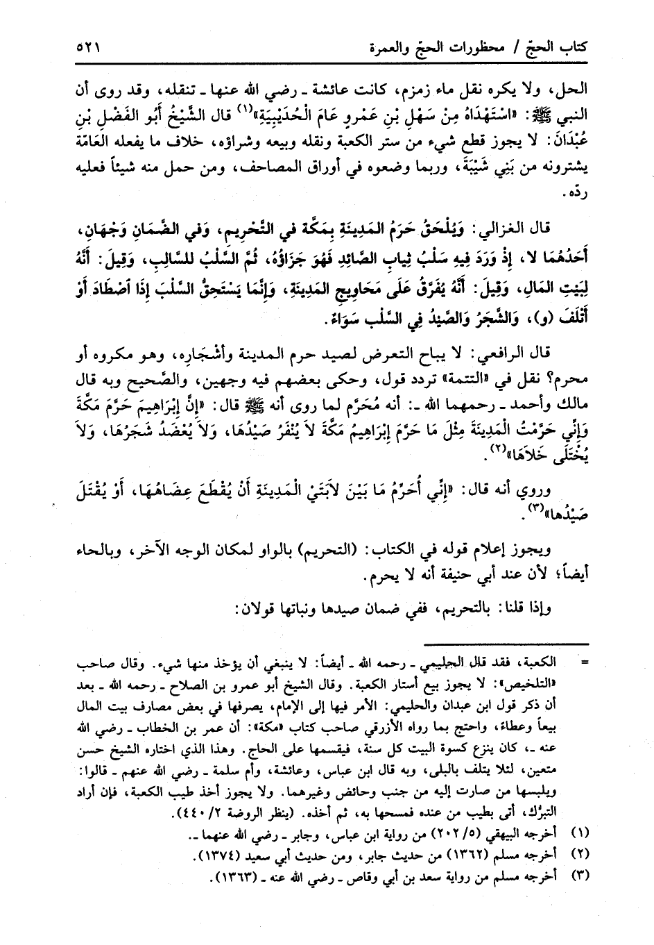 قال الغزالي: وَيُلْحَقُ حَرَمُ المَدِينَةِ بِمَكَّة في التَّحْرِيمِ، وَفي الضَّمَانِ وَجْهَانِ، أَحَدُهُمَا لا، إِذْ وَرَدَ فِيهِ سَلْبُ ثِيابِ الصَّائِدِ فَهُوَ جَزَاوُهُ، ثُمَّ السَّلْبُ للسَّالِبِ، وَقِيلَ: أَنَّهُ لِبَيْتِ المَالِ، وَقِيلَ: أنَّهُ يُفَرَّقُ عَلَى مَحَاوِيجِ المَدِينَةِ، وَإنَّمَا يَسْتَحِقُّ السَّلْبَ إِذَا اصْطَادَ أَوْ أَتْلَفَ (و)، وَالشَّجَرُ وَالصَّيْدُ فِي السَّلْب سَوَاءٌ.
