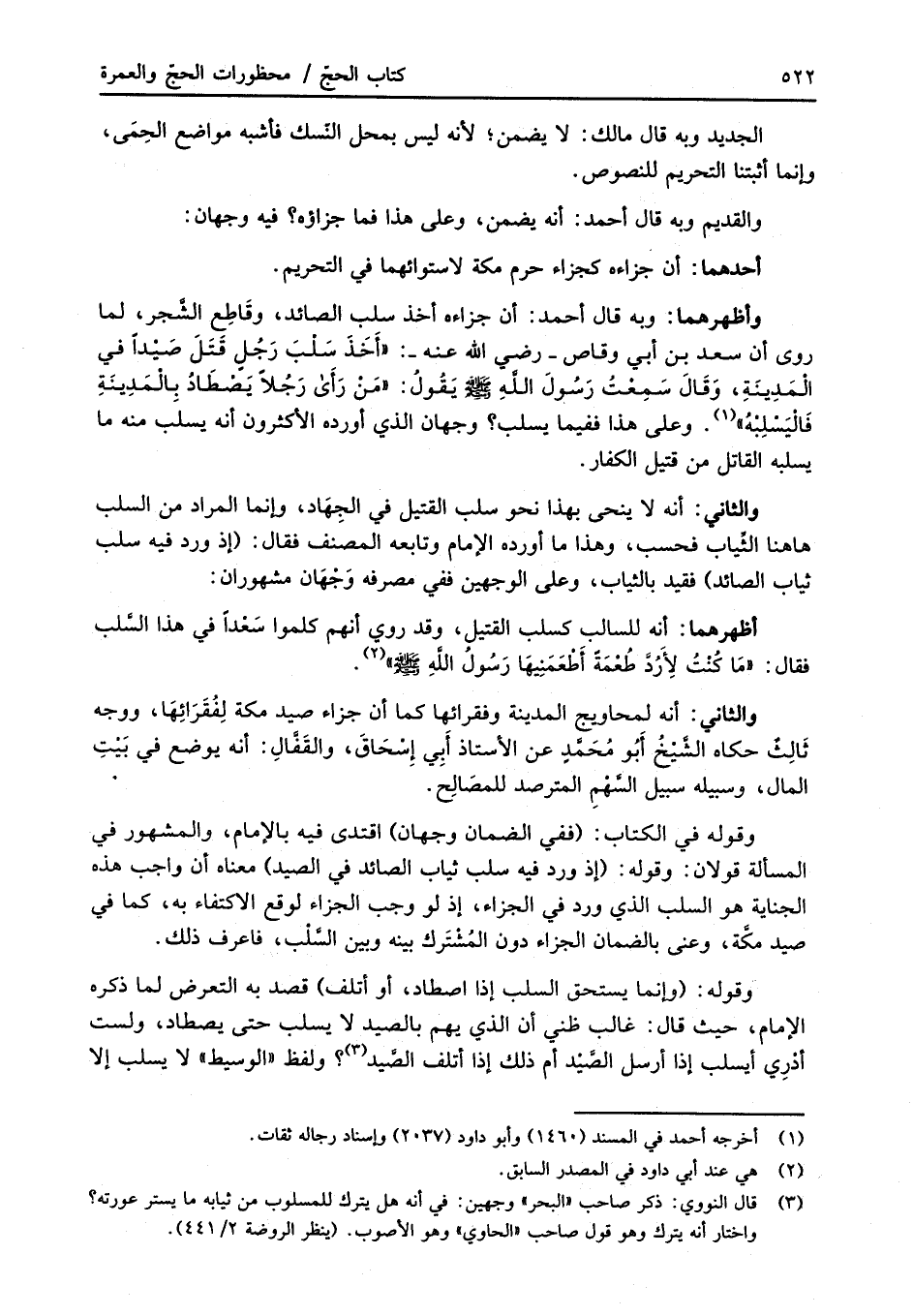 وأظهرهما: وبه قال أحمد: أن جزاءه أخذ سلب الصائد، وقَاطِع الشَّجر، لما روى أن سعد بن أبي وقاص -رضي الله عنه-: "أَخَذَ سَلْبَ رَجُلٍ قَتَلَ صَيْداً في الْمَدِينَةِ، وَقَالَ سَمِعْتُ رَسُولَ اللهِ -صلى الله عليه وسلم- يَقُولُ: "مَنْ رَأَى رَجُلاً يَصْطَادُ بِالْمَدِينَةِ فَالْيَسْلِبْهُ" (¬1). وعلى هذا ففيما يسلب؟ وجهان الذي أورده الأكثرون أنه يسلب منه ما يسلبه القاتل من قتيل الكفار.