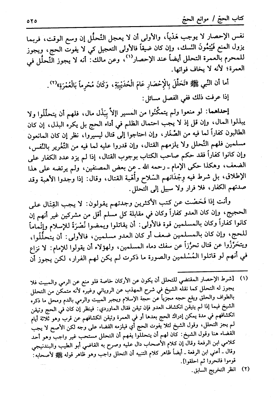 (¬1) [شرط الإحصار المقتضي للتحلل أن يكون عن الأركان خاصة فلو منع عن الرمي والمبيت فلا يجوز له التحلل كما نقله الشيخ في شرح المهذب عن الروياني وغيره لأنه متمكن من التحلل بالطواف والحلق ويقع حجه مجزياً عن حجة الإسلام ويجبر المبيت والرمي بالدم ومحل ما ذكره الشيخ فيما إذا لم يتيقن انكشاف العدو فإن تيقن فقال الماوردي: فينظر إن كان في الحج وتيقن انكشافهم في مدة يمكن إدراك الحج بعدها أو في العمرة وتيقن انكشافهم عن قرب وهو ثلاثة أيام لم يجز التحلل، وقول الشيخ لئلا يفوت الحج أي فيلزمه القضاء على وجه لكن الأصح لا يجب القضاء هنا وقول الشيخ: كان لهم أن يتحللوا يفهم أن التحلل مستحب غير واجب وهو أحد كلامي ابن الرفعة وقال إن كلام الأصحاب دال عليه وصرح به القاضي أبو الطيب والبندنيجي وقال -أعني ابن الرفعة- أيضاً ظاهر كلام التنبيه أن التحلل واجب وهو ظاهر قوله -صلى الله عليه وسلم- لأصحابه: قوموا فانحروا ثم احلقوا].