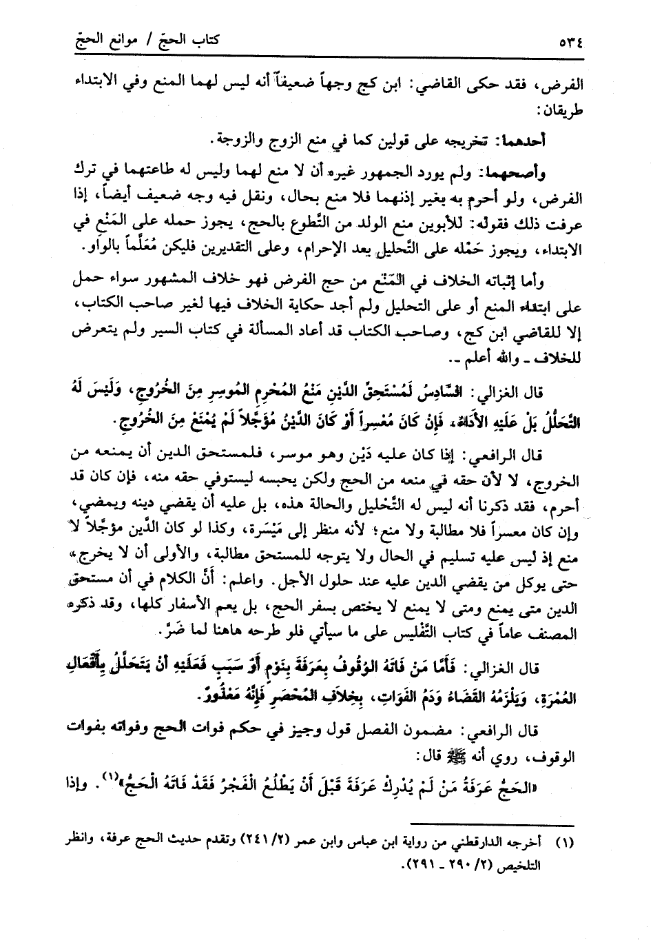 قال الغزالي: فَأمَّا مَنْ فَاتَهُ الوُقُوفُ بِعَرَفَةَ بِنَوْمٍ أَوْ سَبَبٍ فَعَلَيْهِ أنْ يَتَحَلَّلُ بأَفْعَالِ العُمْرَةِ، وَيَلْزَمُهُ القَضَاءُ وَدَمُ الفَوَاتِ، بِخِلاَفِ المُحْصَرِ فَإنَّهُ مَعْذُورٌ.