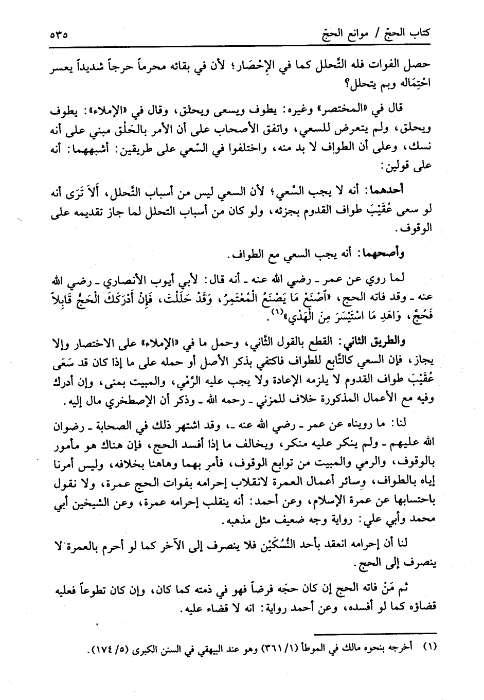 لنا: ما رويناه عن عمر -رضي الله عنه-، وقد اشتهر ذلك في الصحابة -رضوان الله عليهم- ولم ينكر عليه منكر، ويخالف ما إذا أفسد الحج، فإن هناك هو مأمور بالوقوف، والرمي والمبيت من توابع الوقوف، فأمر بهما وهاهنا بخلافه، وليس أمرنا إياه بالطواف، وسائر أعمال العمرة لانقلاب إحرامه بفوات الحج عمرة، ولا نقول باحتسابها عن عمرة الإسلام، وعن أحمد: أنه ينقلب إحرامه عمرة، وعن الشيخين أبي محمد وأبي علي: رواية وجه ضعيف مثل مذهبه.