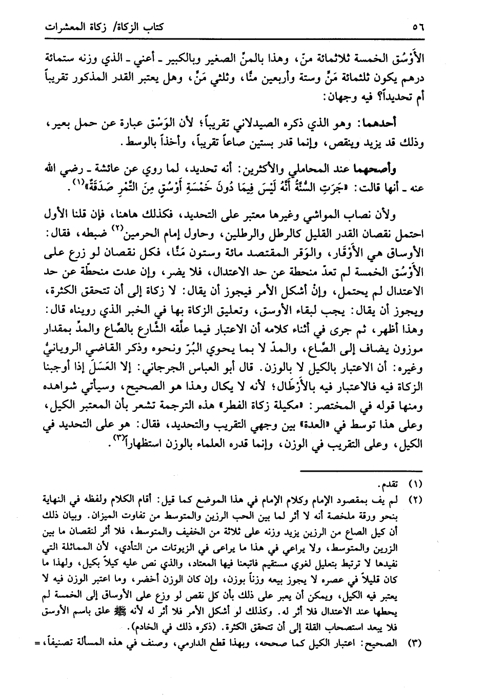 ولأن نصاب المواشي وغيرها معتبر على التحديد، فكذلك هاهنا، فإن قلنا الأول احتمل نقصان القدر القليل كالرطل والرطلين، وحاول إمام الحرمين (¬2) ضبطه، فقال: الأوساق هي الأَوْقَار، والوَقر المقتصد مائة وستون مَنًّا، فكل نقصان لو زرع على الأَوْسُق الخمسة لم تعدّ منحطة عن حد الاعتدال، فلا يضر، وإن عدت منحطّة عن حد الاعتدال لم يحتمل، وإنْ أشكل الأمر فيجوز أن يقال: لا زكاة إلى أن تتحقق الكثرة، ويجوز أن يقال: يجب لبقاء الأوسق، وتعليق الزكاة بها في الخبر الذي رويناه قال: وهذا أظهر، ثم جرى في أثناء كلامه أن الاعتبار فيما علَّقه الشَّارع بالصَّاع والمدّ بمقدار موزون يضاف إلى الصَّاع، والمدّ لا بما يحوي البُرّ ونحوه وذكر القاضي الرويانيُّ وغيره: أن الاعتبار بالكيل لا بالوزن. قال أبو العباس الجرجاني: إلا العَسَلَ إذا أوجبنا الزكاة فيه فالاعتبار فيه بالأَرْطَال؛ لأنه لا يكال وهذا هو الصحيح، وسيأتي شواهده ومنها قوله في المختصر: "مكيلة زكاة الفطر" هذه الترجمة تشعر بأن المعتبر الكيل، وعلى هذا توسط في "العدة" بين وجهي التقريب والتحديد، فقال: هو على التحديد في الكيل، وعلى التقريب في الوزن، وإنما قدره العلماء بالوزن استظهاراً (¬3).