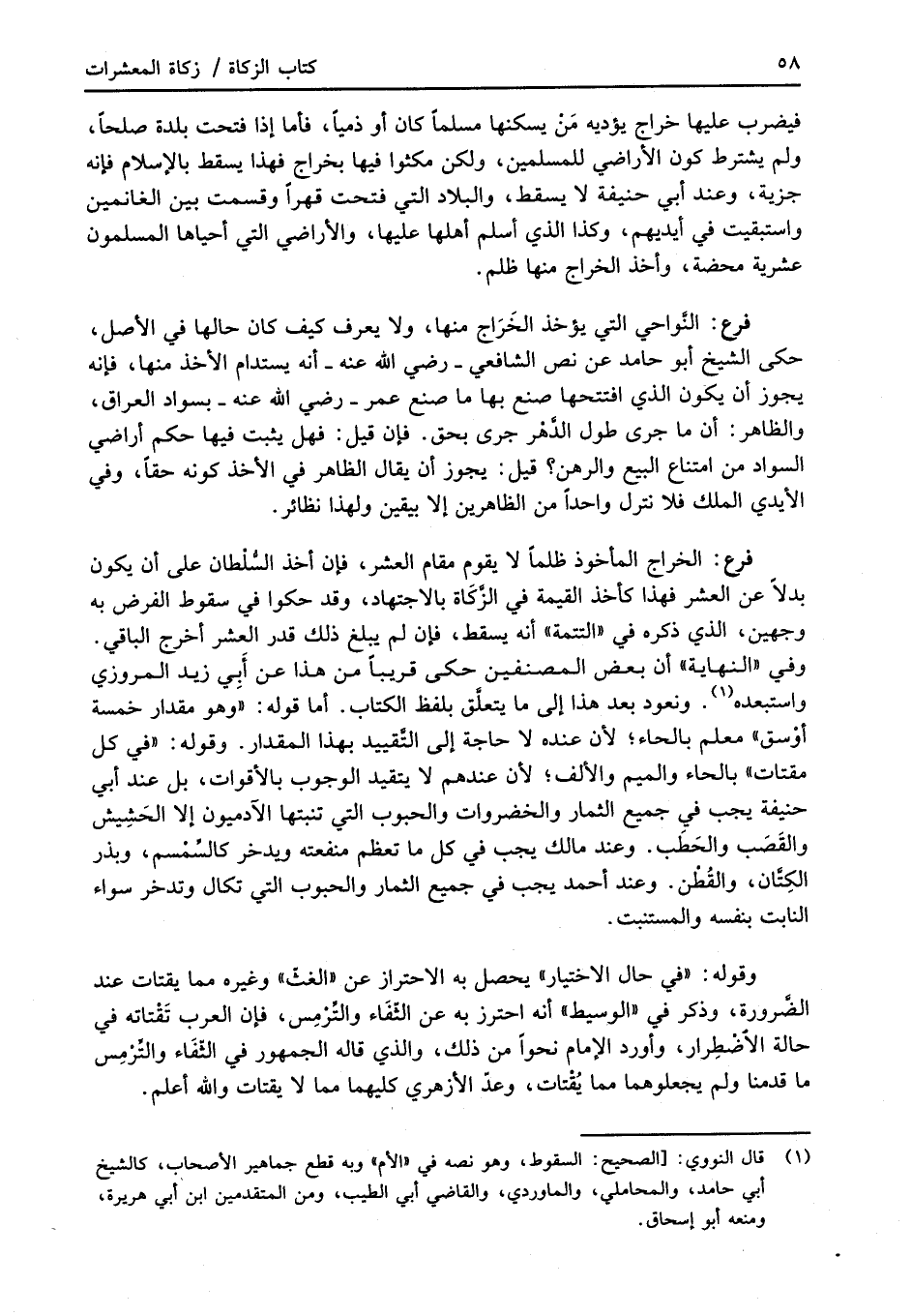 فرع: الخراج المأخوذ ظلماً لا يقوم مقام العشر، فإن أخذ السُّلْطان على أن يكون بدلاً عن العشر فهذا كأخذ القيمة في الزَّكَاة بالاجتهاد، وقد حكوا في سقوط الفرض به وجهين، الذي ذكره في "التتمة" أنه يسقط، فإن لم يبلغ ذلك قدر العشر أخرج الباقي. وفي "النهاية" أن بعض المصنفين حكى قريباً من هذا عن أَبِي زيد المروزي واستبعده (¬1). ونعود بعد هذا إلى ما يتعلَّق بلفظ الكتاب. أما قوله: "وهو مقدار خمسة أوْسق" معلم بالحاء؛ لأن عنده لا حاجة إلى التَّقييد بهذا المقدار. وقوله: "في كل مقتات" بالحاء والميم والألف؛ لأن عندهم لا يتقيد الوجوب بالأقوات، بل عند أبي حنيفة يجب في جميع الثمار والخضروات والحبوب التي تنبتها الآدميون إلا الحَشِيش والقَصَب والحَطَب. وعند مالك يجب في كل ما تعظم منفعته ويدخر كالسِّمْسم، وبذر الكِتَّان، والقُطْن. وعند أحمد يجب في جميع الثمار والحبوب التي تكال وتدخر سواء النابت بنفسه والمستنبت.