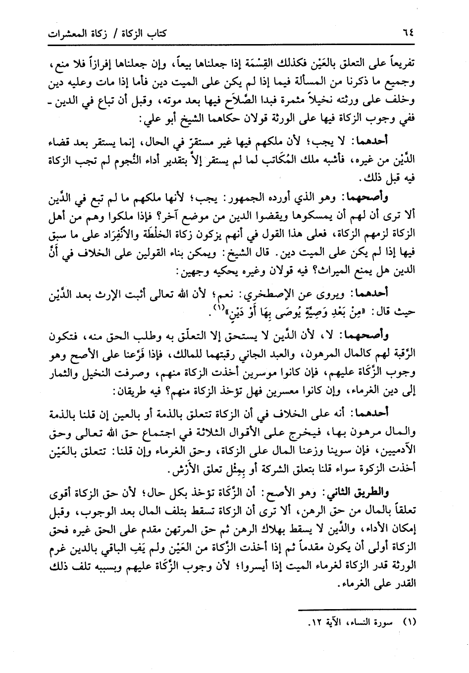 وأصحهما: وهو الذي أورده الجمهور: يجب؛ لأنها ملكهم ما لم تبع في الدَّين ألا ترى أن لهم أن يمسكوها ويقضوا الدين من موضع آخر؟ فإذا ملكوا وهم من أهل الزكاة لزمهم الزكاة، فعلى هذا القول في أنهم يزكون زكاة الخلْطَة والانْفِرَاد على ما سبق فيها إذا لم يكن على الميت دين. قال الشيخ: ويمكن بناء القولين على الخلاف في أَنَّ الدين هل يمنع الميراث؟ فيه قولان وغيره يحكيه وجهين: