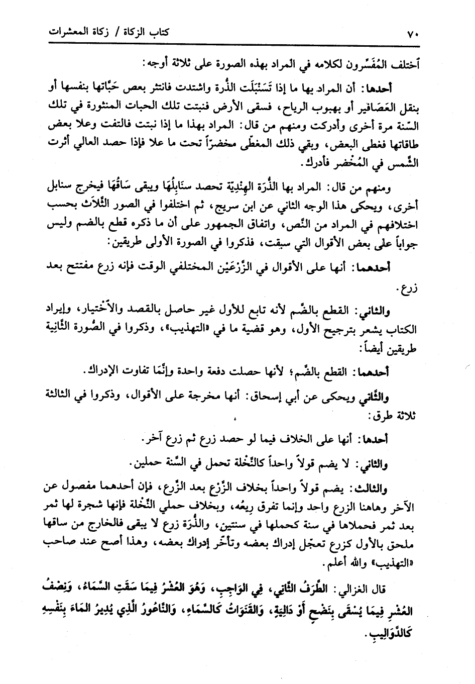 قال الغزالي: الطَّرَفُ الثَّاني، فِي الوَاجِبِ، وَهوَ العُشْرُ فِيمَا سَقَتِ السَّمَاء، وَنِصْفُ العُشْرِ فِيمَا يُسْقَى بِنَضْحٍ أَوْ دَالِيَةٍ، وَالقَنَوَاتُ كَالسَّمَاءِ، وَالنَّاعُورُ الَّذِي يُديرُ المَاءَ بِنَفْسِهِ كَالدَّوَالِيبِ.