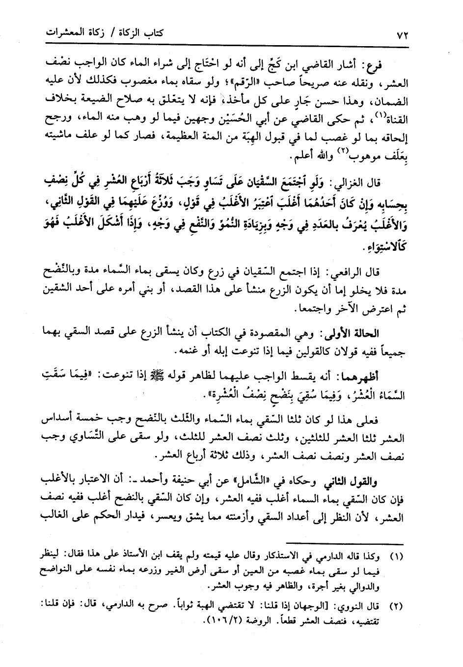 نوع: أشار القاضي ابن كَجِّ إلى أنه لو احْتَاج إلى شراء الماء كان الواجب نصْف العشر، ونقله عنه صريحاً صاحب "الرّقم"؛ ولو سقاه بماء مغصوب فكذلك لأن عليه الضمان، وهذا حسن جَارٍ على كل مأخذ، فإنه لا يتعّلق به صلاح الضيعة بخلاف القناة (¬1)، ثم حكى القاضي عن أبي الحُسَيْن وجهين فيما لو وهب منه الماء، ورجح إلحاقه بما لو غصب لما في قبول الهِبَة من المنة العظيمة، فصار كما لو علف ماشيته بِعَلَف موهوب (¬2) والله أعلم.
