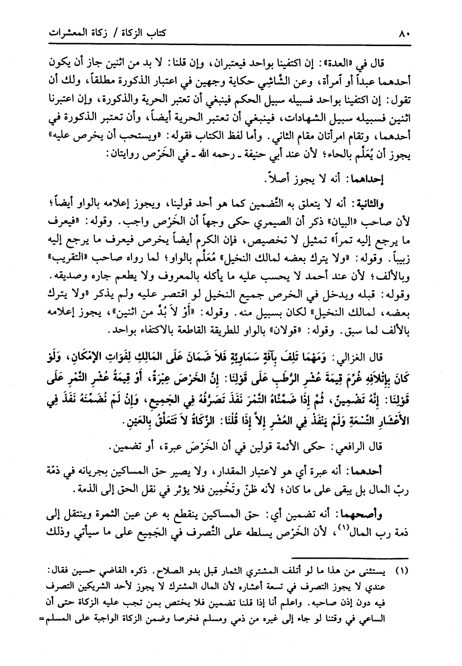 والثانية: أنه لا يتعلق به التَّضمين كما هو أحد قولينا، ويجوز إعلامه بالواو أيضاً؛ لأن صاحب "البيان" ذكر أن الصيمري حكى وجهاً أن الخَرْص واجب. وقوله: "فيعرف ما يرجع إليه تمراً" تمثيل لا تخصيص، فإن الكرم أيضاً يخرص فيعرف ما يرجع إليه زبيباً. وقوله: "ولا يترك بعضه لمالك النخيل" مُعَلَّم بالواو؛ لما رواه صاحب "التقريب" وبالألف؛ لأن عند أحمد لا يحسب عليه ما يأكله بالمعروف ولا يطعم جاره وصديقه. وقوله: قبله ويدخل في الخرص جميع النخيل لو اقتصر عليه ولم يذكر "ولا يترك بعضه، لمالك النخيل" لكان بسبيل منه. وقوله: "أَوْ لاَ بُدَّ من اثنين"، يجوز إعلامه بالألف لما سبق. وقوله: "قولان" بالواو للطريقة القاطعة بالاكتفاء بواحد.