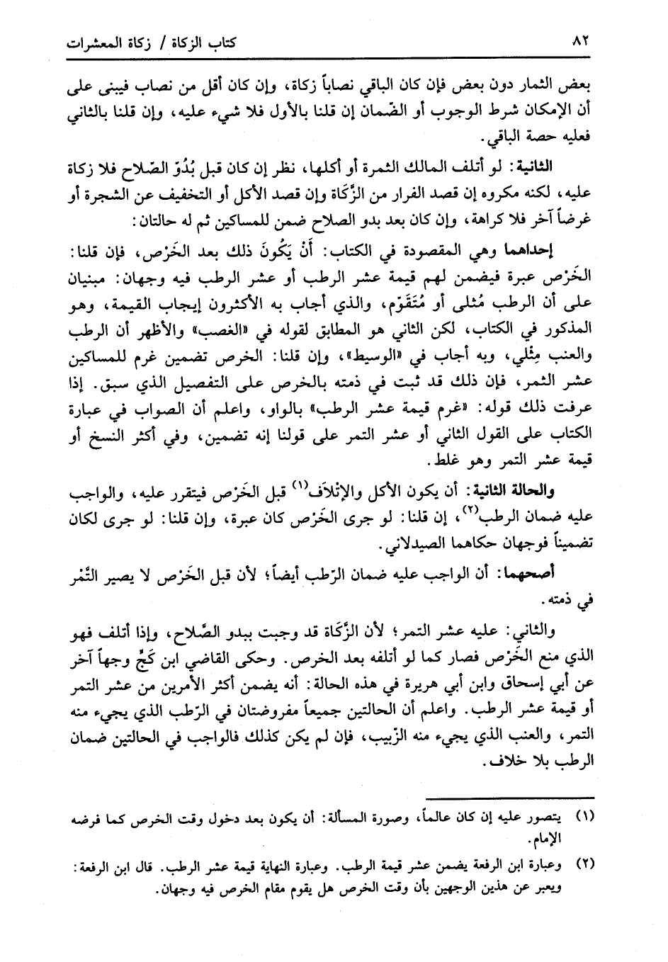 (¬2) وعبارة ابن الرفعة يضمن عشر قيمة الرطب. وعبارة النهاية قيمة عشر الرطب. قال ابن الرفعة: ويعبر عن هذين الوجهين بأن وقت الخرص هل يقوم مقام الخرص فيه وجهان.
