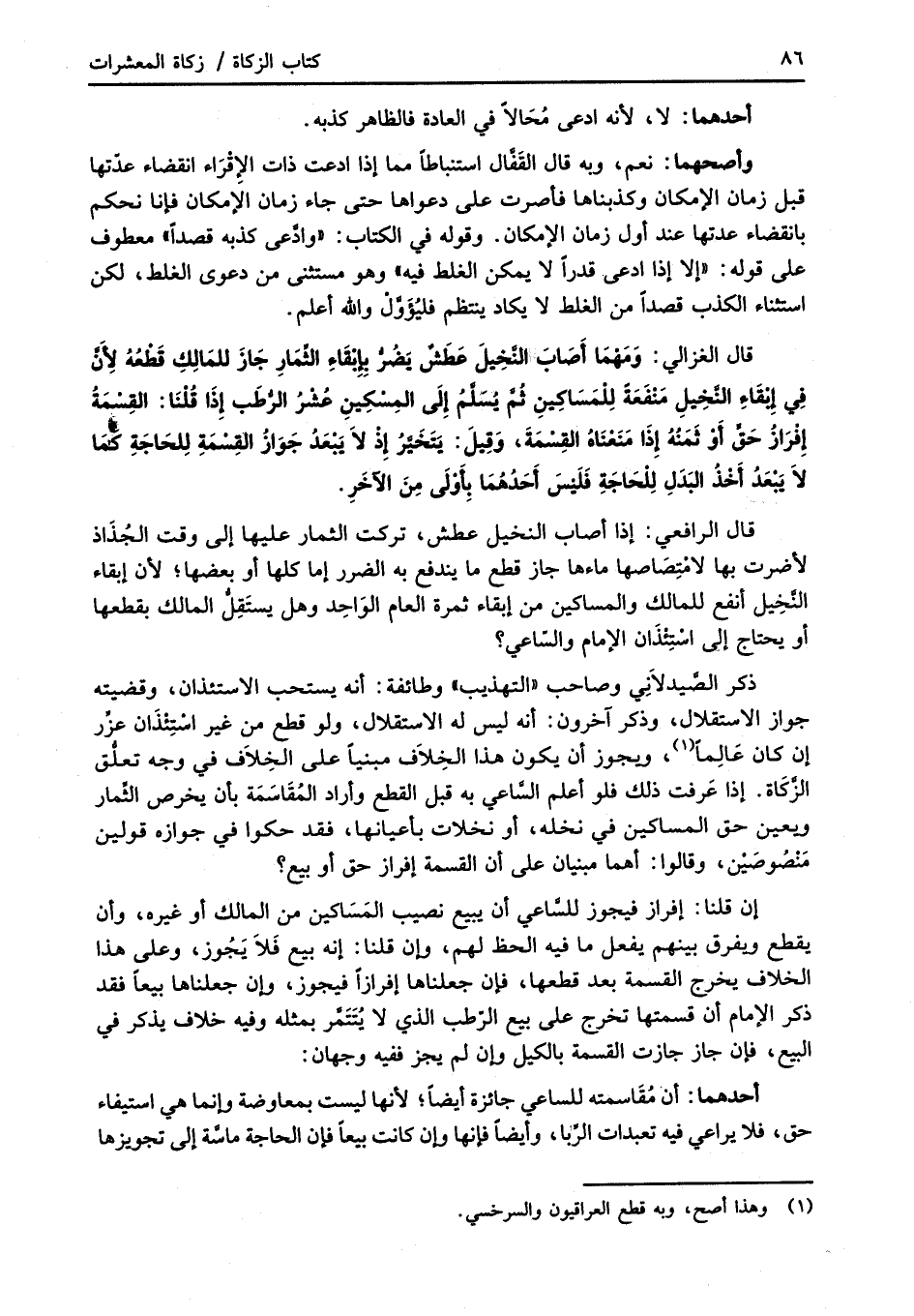 قال الغزالي: وَمَهْمَا أَصابَ النَّخِيلَ عَطَشٌ يَضُرُّ بِإبْقَاءِ الثِّمَارِ جَازَ للمَالِكِ قَطْعُهُ لِأَنَّ فِي إبْقَاءِ النَّخِيلِ مَنْفَعَةً لِلْمَسَاكِينِ ثُمَّ يُسَلَّمُ إلَى المِسْكينِ عُشْرُ الرُّطَب إِذَا قُلْنَا: القِسْمَةُ إفْرَازُ حَقّ أَوْ ثَمَنُهُ إِذَا مَنَعْنَاهُ القِسْمَةَ، وَقِيلَ: يَتَخَيَّرُ إِذْ لاَ يَبْعَدُ جَوَازُ القِسْمَةِ لِلحَاجَةِ كمَا لاَ يَبْعَدُ أَخْذُ البَدَلِ لِلْحَاجَةِ فَلَيْسَ أَحَدُهُمَا بِأَوْلَى مِنَ الآخَرِ.