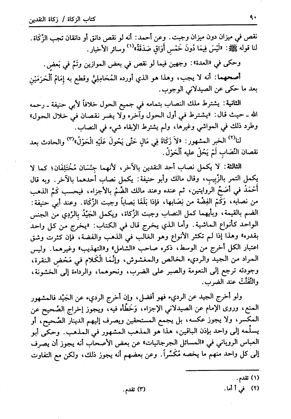 الثالثة: لا يكمل نصاب أحد النقدين بالآخر، لأنهما جِنْسَان مُخْتَلِفَان؛ كما لا يكمل التمر بالزَّبِيب، وقال مالك وأبو حنيفة: يكمل نصاب أَحدهما بالآخر. وبه قال أَحْمَدُ في أصَحِّ الرَوايتين، ثم عنده وعند مالك الضَّمُ بالأجزاء، فيحسب كَمَّ الذهب من نصابه، وَكَمّ الفِضَّة من نِصَابها، فإذا بَلَغَا نِصاباً وجبت الزَّكَاة. وعند أبي حنيفة: الضم بالقيمة، وبأيهما كمل النصاب وجبت الزَّكاة، وبكمل الجَيِّدُ بِالرَّدِي من الجنس الواحد كأنواع الماشية. وأما الذي يخرج قال في الكتاب: "يخرج من كل واحد بقدره" وهذا إذا لم تكثر الأنواع وهو الغالب في الذهب والفضة، فإن كثرت وشق اعتبار الكل أخرج من الوسط، ذكره صاحب "الشامل" و"التهذيب" وغيرهما. وليس المراد من الجيد والرديء الخالص والمغشوش، وإنَّمَا الْكَلام في مَحْضِ النقرة، وجودته ترجع إلى النعومة والصبر على الضرب، ونحوهما، والرداءة إلى الخشونة، والتَّفَتُّتْ عند الضرب.