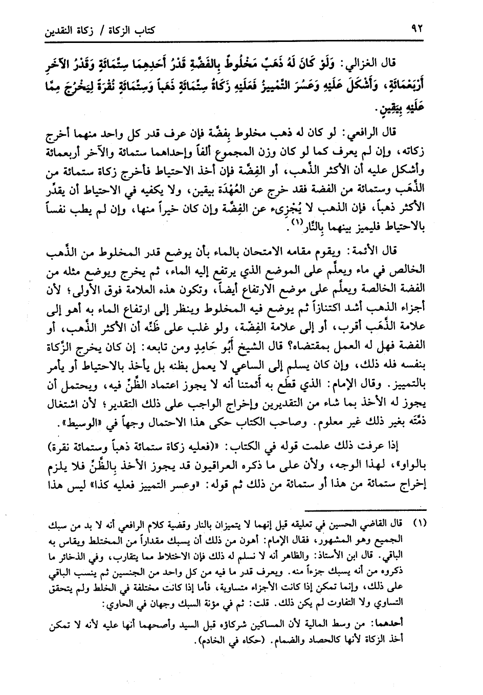 قال الغزالي: وَلَوْ كَانَ لَهُ ذَهَبٌ مَخْلُوطٌ بِالفَضَّةِ قَدْرُ أَحَدِهِمَا سِتِّمَائَةٍ وَقَدْرُ الآخَرِ أَرْبَعْمَائَةٍ، وَأَشْكَلَ عَلَيْهِ وَعَسُرَ التَّمْييزُ فَعَلَيْهِ زَكَاةُ سِتَّمَائَةٍ ذَهَباً وَستِّمَائَةٍ نُقْرَةً لِيَخْرُجَ مِمَّا عَلَيْهِ بِيَقِينٍ.