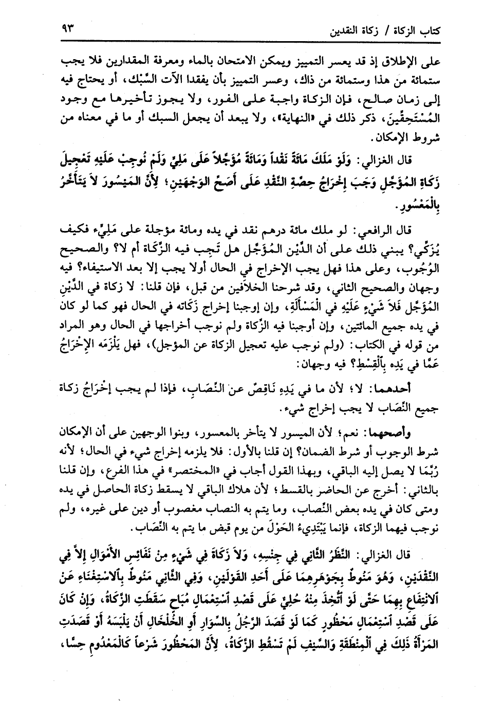 قال الغزالي: وَلَوْ مَلَكَ مَائَةً نَقْداً وَمَائَةً مُؤَجَّلاً عَلَى مَلِيِّ وَلَمْ نُوجِبْ عَلَيْهِ تَعْجِيلَ زَكَاةِ المُؤَجَّلِ وَجَبَ إِخْرَاجُ حِصَّةِ النَّقْدِ عَلَى أَصَحِّ الوَجْهَيْنِ؛ لِأَنَّ المَيْسُورَ لاَ يَتَأخَّرُ بِالْمَعْسُورِ.