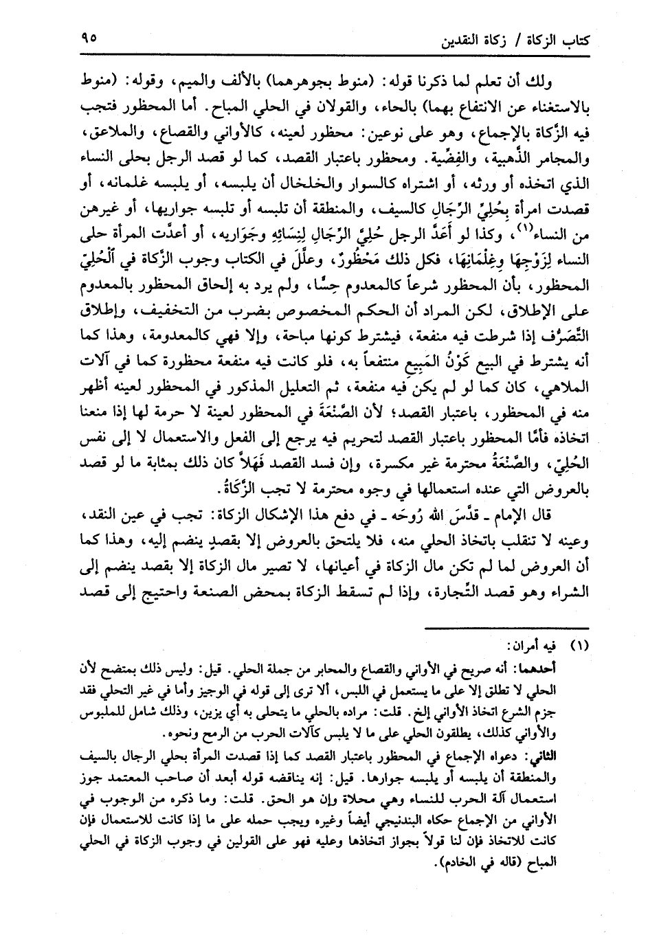 قال الإمام- قدَّسَ الله رُوحَه- في دفع هذا الإشكال الزكاة: تجب في عين النقد، وعينه لا تنقلب باتخاذ الحلي منه، فلا يلتحق بالعروض إلا بقصدٍ ينضم إليه، وهذا كما أن العروض لما لم تكن مال الزكاة في أعيانها، لا تصير مال الزكاة إلا بقصد ينضم إلى الشراء وهو قصد التِّجارة، وإذا لم تسقط الزكاة بمحض الصنعة واحتيج إلى قصد