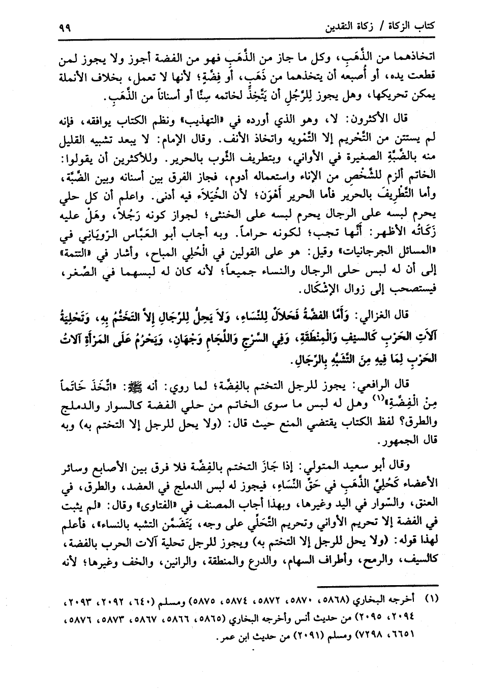 قال الغزالي: وَأَمَّا الفضَّةُ فَحَلاَلٌ لِلنِّسَاءِ، وَلاَ يَحِلُّ لِلرِّجَالِ إلاَّ التَخَتُّمُ بِهِ، وَتَحْلِيَةُ آلاَتِ الحَرْبِ كَالسيْفِ وَالْمِنْطَقَةِ، وَفِي السَّرْجِ وَاللِّجَامِ وَجْهَانِ، وَيَحْرُمُ علَى المَرْأَةِ آلاتُ الحَرْبِ لِمَا فِيهِ مِنَ التَّشَبُّهِ بِالرِّجَالِ.