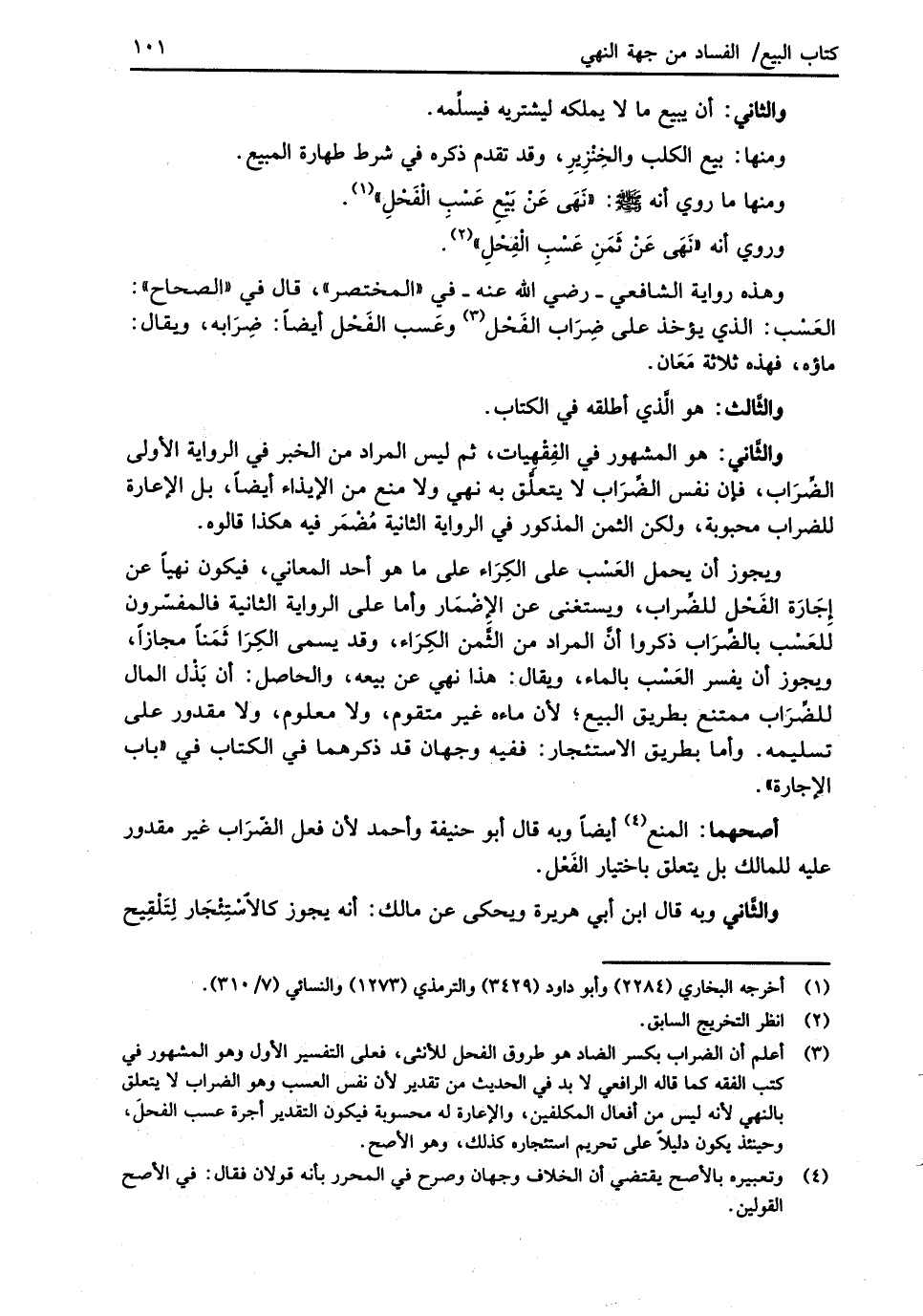 (¬3) أعلم أن الضراب بكسر الضاد هو طروق الفحل للأنثى، فعلى التفسير الأول وهو المشهور في كتب الفقه كما قاله الرافعي لا بد في الحديث من تقدير لأن نفس العسب وهو الضراب لا يتعلق بالنهي لأنه ليس من أفعال المكلفين، والإعارة له محسوبة فيكون التقدير أجرة عسب الفحلَ، وحينئذ يكون دليلًا على تحريم استئجاره كذلك، وهو الأصح.