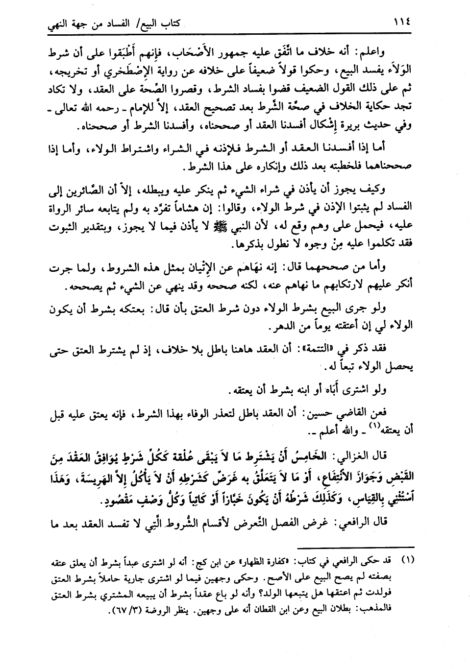 واعلم: أنه خلاف ما اتَّفَق عليه جمهور الأَصْحَاب، فإنهم أَطْبَقوا على أن شرط الوَلاَء يفسد البيع، وحكوا قولاً ضعيفاً على خلافه عن رواية الِإصْطَخري أو تخريجه، ثم على ذلك القول الضعيف قضوا بفساد الشرط، وقصروا الصِّحة على العقد، ولا تكاد تجد حكاية الخلاف في صحّة الشَّرط بعد تصحيح العقد، إلاَّ للإمام -رحمه الله تعالى- وفي حديث بريرة إِشْكال أفسدنا العقد أو صححناه، وأفسدنا الشرط أو صححناه.
