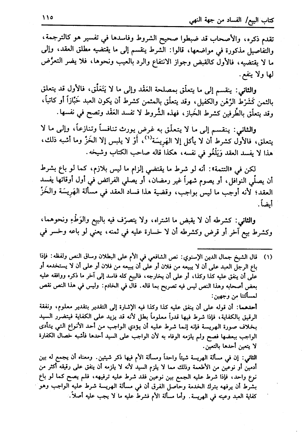 (¬1) قال الشيخ جمال الدين الإسنوي: نص الشافعي في الأم على البطلان وساق النص ولفظه: فإذا باع الرجل العبد على أن لا يبيعه من فلان أو على أن يبيعه من فلان أو على أن لا يستخدمه أو على أن ينفق عليه كذا وكذا، أو على أن يخارجه، فالبيع كله فاسد إلى آخر ما ذكره ووافقه عليه بعض أصحابه وهذا النص ليس فيه تصريح بما قاله. قال في الخادم: وليس في هذا النص نقص لمسألتنا من وجهين: