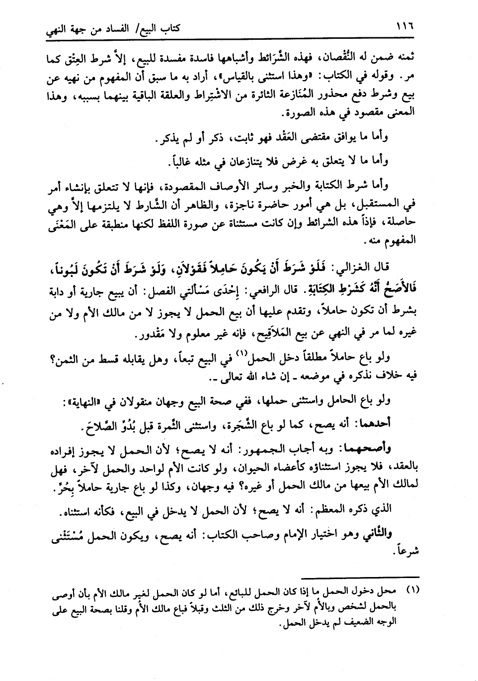 قال الرافعي: إِحْدَى مَسْألتي الفصل: أن يبيع جارية أو دابة بشرط أن تكون حاملاً، وتقدم عليها أن بيع الحمل لا يجوز لا من مالك الأم ولا من غيره لما مر في النهي عن بيع المَلاَقِيح، فإنه غير معلوم ولا مَقْدور.