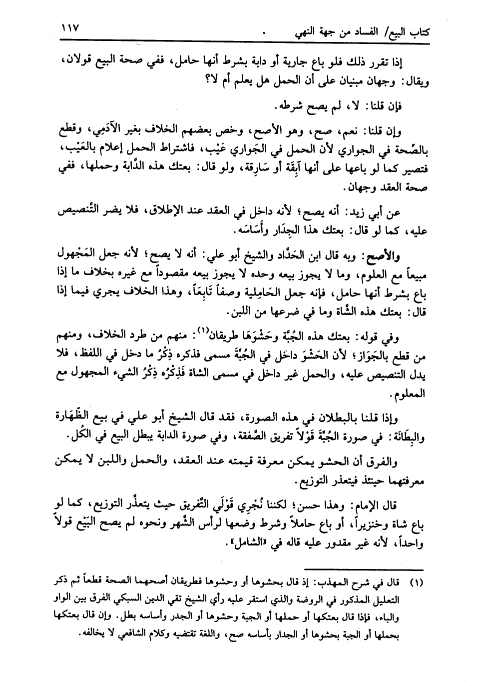 وفي قوله: بعتك هذه الجُبَّة وحَشْوَهَا طريقان (¬1): منهم من طرد الخلاف، ومنهم من قطع بالجَوَاز؛ لأن الحَشْوَ داخل في الجُبَّةَ مسمى فذكره ذِكْرُ ما دخل في اللفظ، فلا يدل التنصيص عليه، والحمل غير داخل في مسمى الشاة فَذِكْرُه ذِكْرُ الشيء المجهول مع المعلوم.