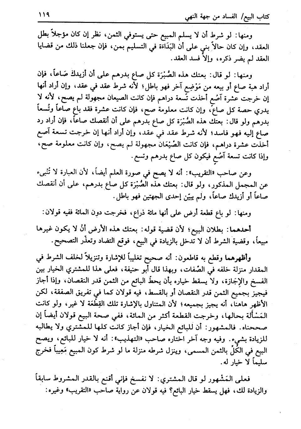 ومنها: لو قال: بعتك هذه الصُّبْرَة كل صاع بدرهم على أن أزيدك صَاعاً، فإن أراد هبة صاع أو بيعه من مَوْضِعٍ آخر فهو باطل؛ لأنه شرط عقد في عقد، وإن أراد أنها إن خرجت عشرة آصُعٍ أخذت تسعة دراهم فإن كانت الصيعان مجهولة لم يصح، لأنه لا يدري حصة كل صاع، وإن كانت معلومة صح، فإن كانت عشرة فقد باع صاعاً وتُسعاً بدرهم ولو قال: بعتك هذه الصُّبْرَة كل صاع بدرهم على أن أنقصك صاعاً، فإن أراد رد صاع إليه فهو فاسد؛ لأنه شرط عقد في عقد، وإن أراد أنها إن خرجت تسعة آصع أخذت عشرة دراهم، فإن كانت الصِّيْعَان مجهولة لم يصح، وإن كانت معلومة صح، وإذا كانت تسعة آصُعٍ فيكون كل صاع بدرهم وتسع.