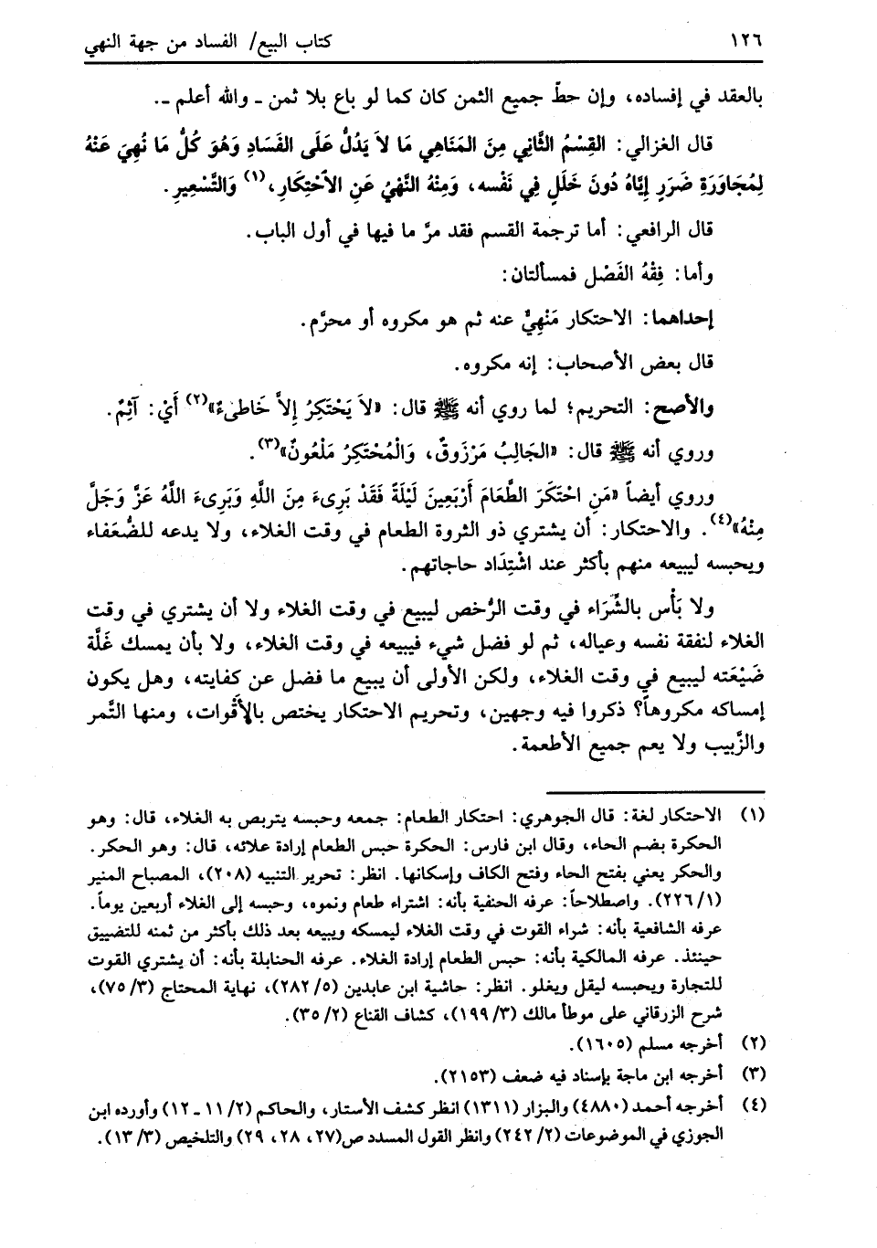 قال الغزالي: القِسْمُ الثَّانِي مِنَ المَنَاهِي مَا لاَ يدُلُّ عَلَى الفَسَادِ وَهُوَ كُلُّ مَا نُهِيَ عَنْهُ لِمجَاوَرَةِ ضَرَرِ إيَّاهُ دُونَ خَلَلِ فِي نَفْسه، وَمِنْهُ النَّهْيُ عَنِ الاحْتِكَارِ، (¬1) وَالتَّسْعِيرِ.