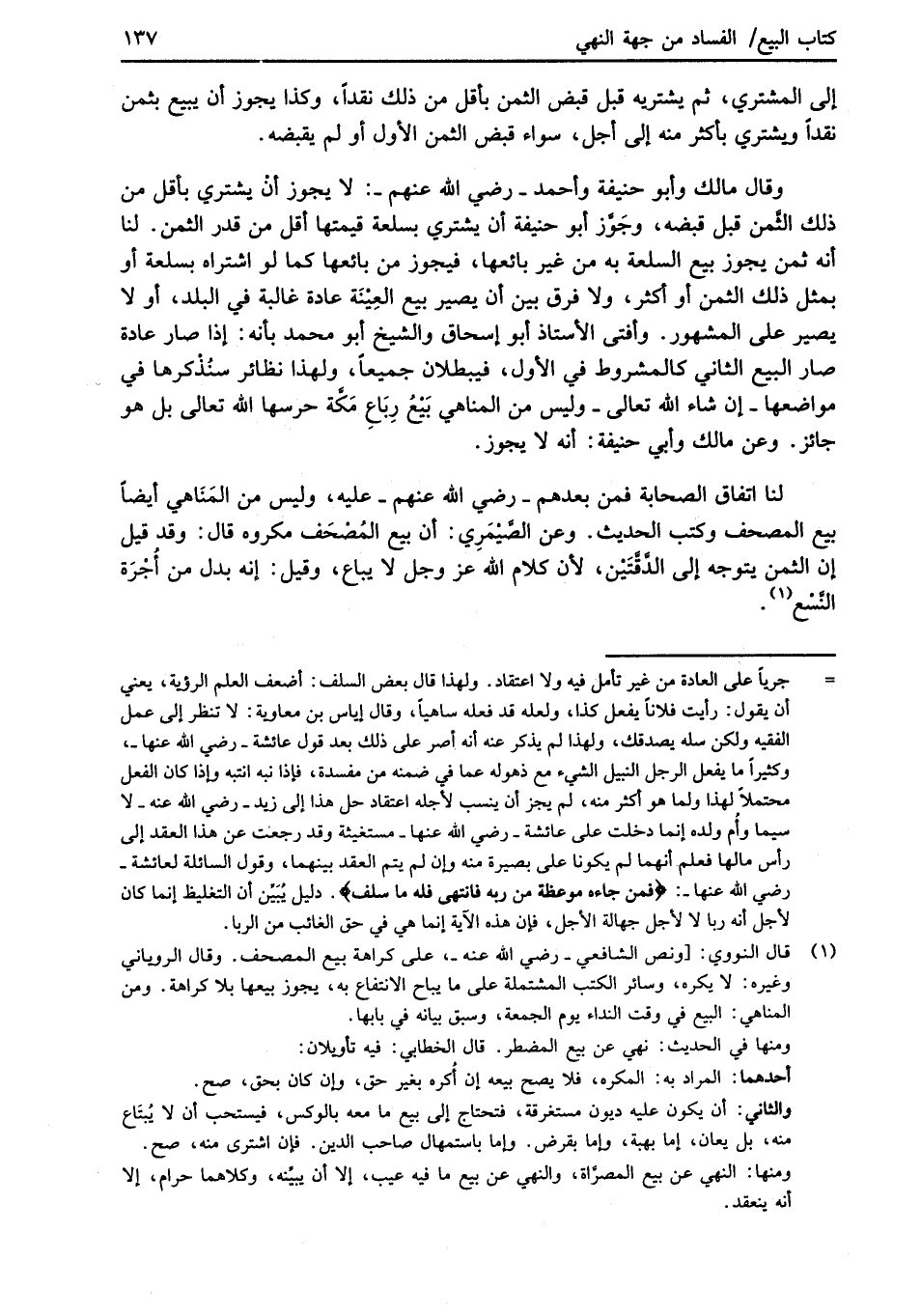 (¬1) قال النووي: [ونص الشافعي -رضي الله عنه-، على كراهة بيع المصحف. وقال الروياني وغيره: لا يكره، وسائر الكب المشتملة على ما يباح الانتفاع به، يجوز بيعها بلا كراهة. ومن المناهي: البيع في وقت النداء يوم الجمعة، وسبق بيانه في بابها.