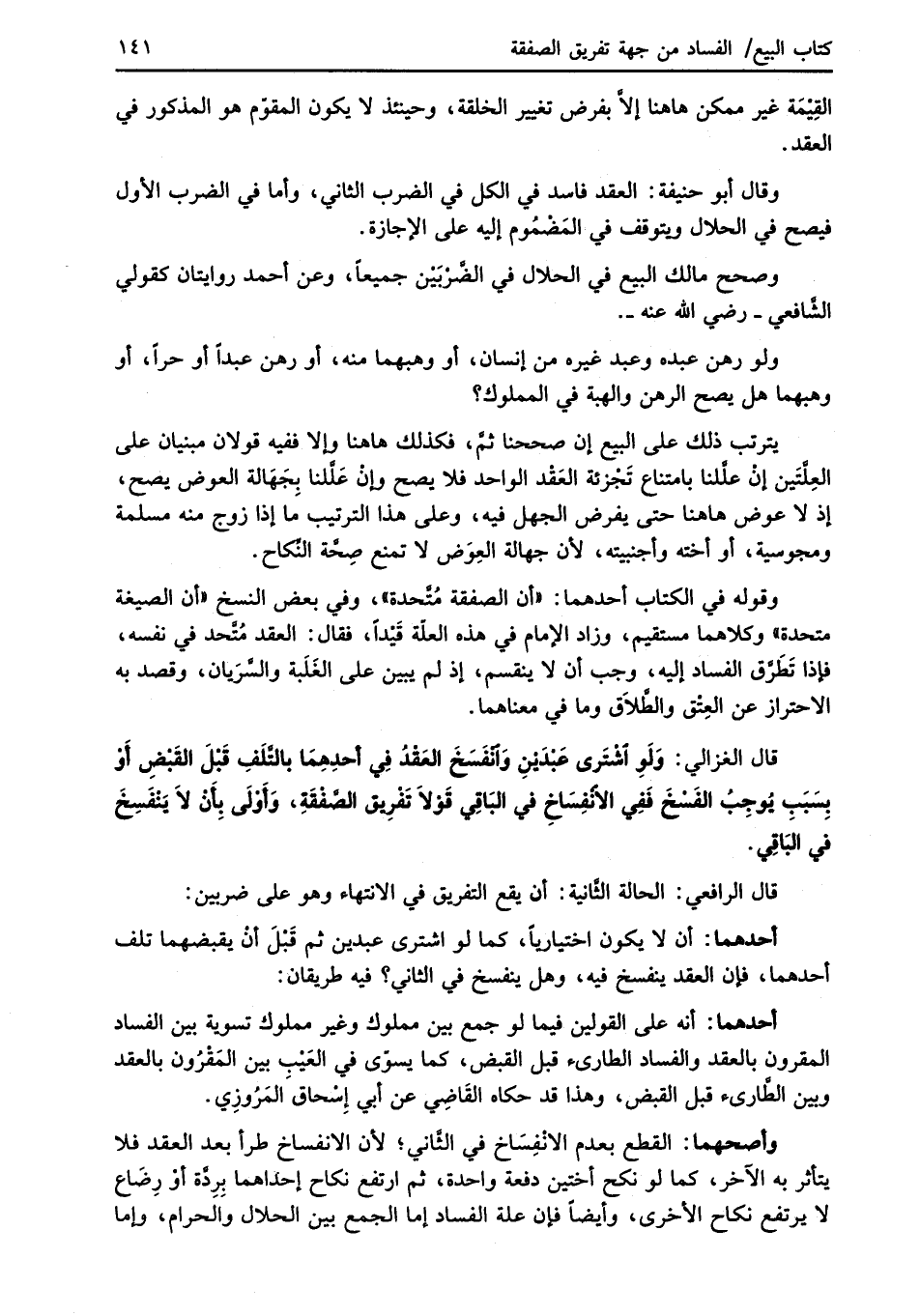 قال الغزالي: وَلَوِ اشْتَرى عَبْدَيْنِ وَانْفَسَخَ العَقْدُ فِي أحدِهِمَا بالتَّلَفِ قَبْلَ القَبْضِ أَوْ بِسَبَبِ يُوجِبُ الفَسْخَ فَفِي الانْفِسَاخِ في البَاقِي قَوْلاً تَفْرِيق الصَّفْقَةِ، وَأَوْلَى بِأَن لاَ يَنْفَسِخَ في البَاقِي.